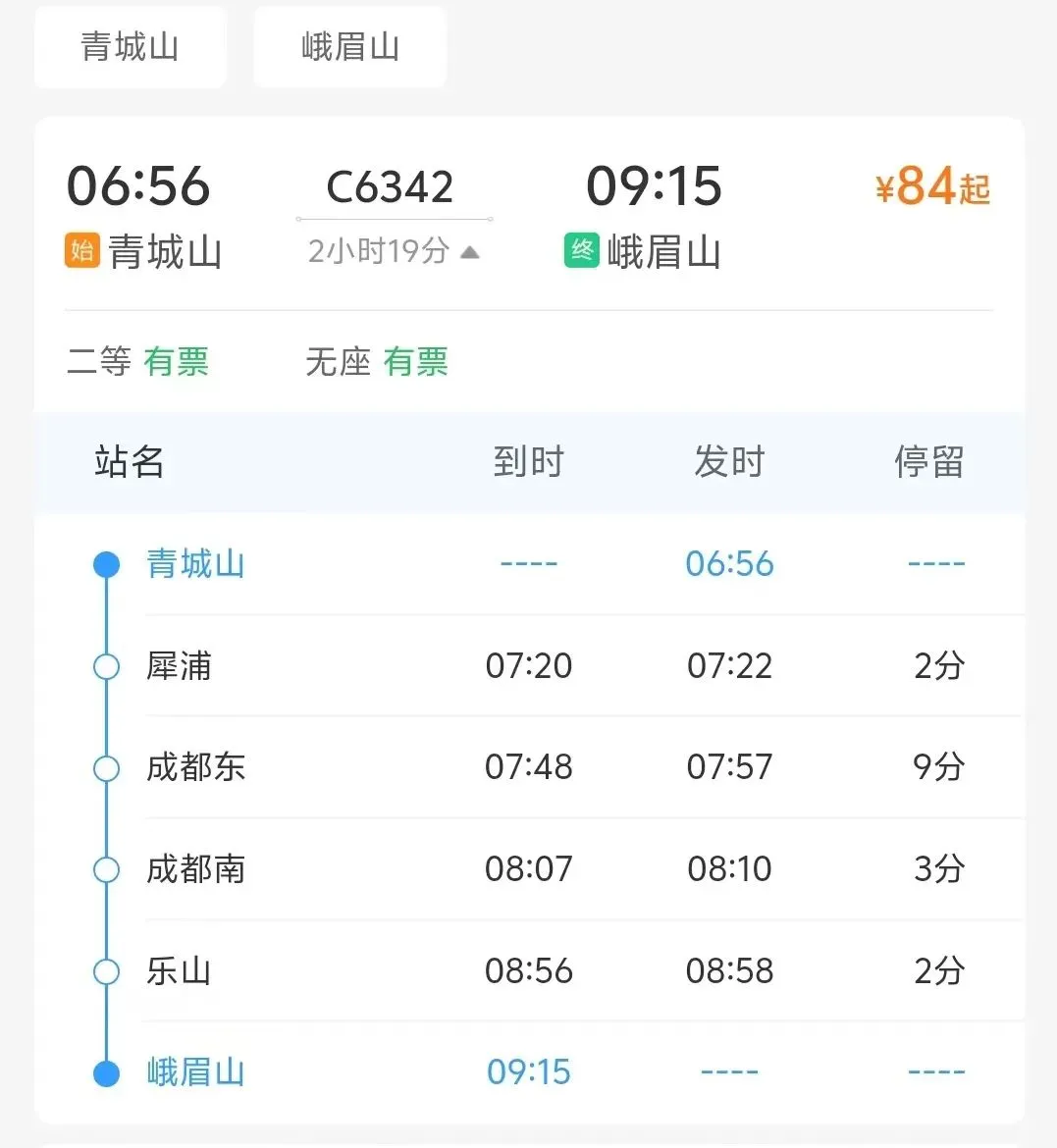 青城山→峨眉山C6342次列车:青城山站始发,途经犀浦、成都东、成都南、乐山,终到峨眉山站。