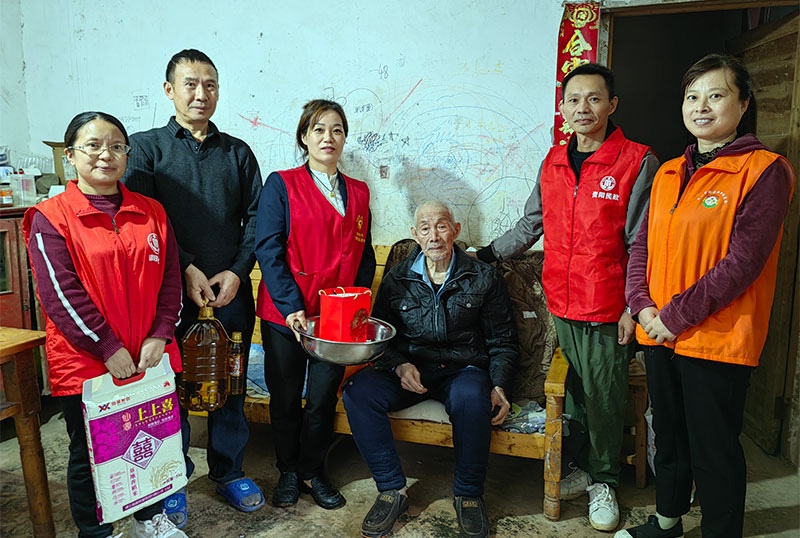重阳节当日,记者跟随团碑村志愿者们来到3组方洪良老人家中,只见老人正坐在沙发上休养,接着,志愿者们为老人呈上大米、菜油、纪念碗、毛巾、盆子等生活物资,并为老人按摩,让老人足不出户也能感受到节日的温暖与关怀。