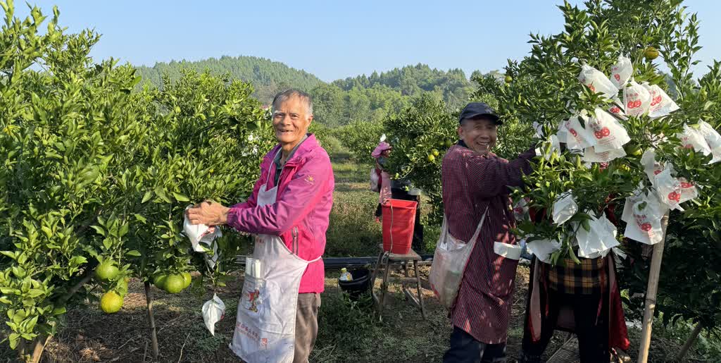 在柑橘种植基地,果农们手法娴熟地从腰间抽出专用纸袋,为柑橘套上“保护衣”。一套、二按、三扭紧,动作迅速且准确,不一会儿,一棵棵果树就被装扮得焕然一新。一位果农边忙碌边分享道:“我们套的袋子防风防水,我每天能套九百多个呢!”