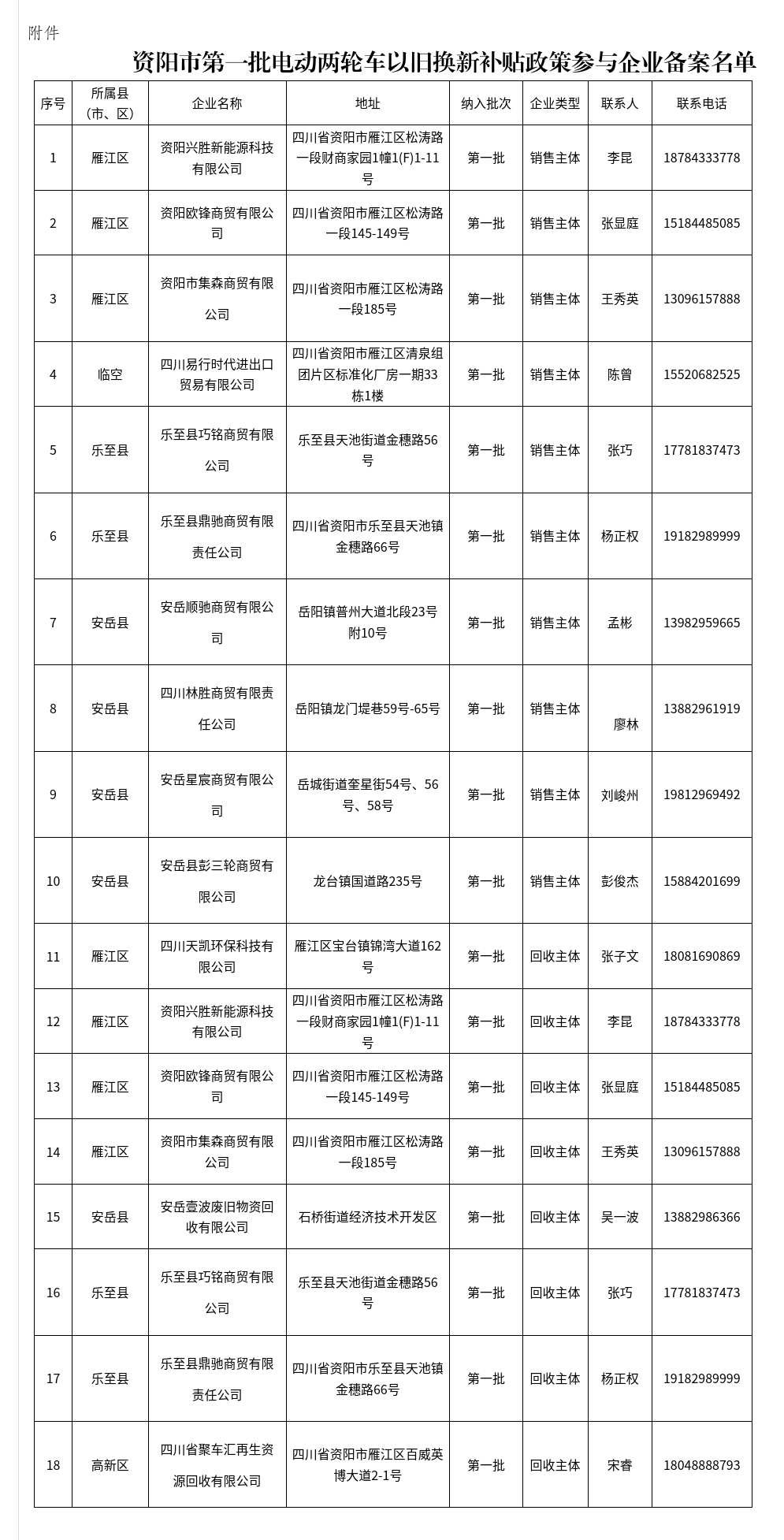 10月21日,资阳市商务局公示了2024年资阳市第一批电动两轮车以旧换新补贴政策参与企业备案名单,公示时间为2024年10月21日至2024年10月23日,共3天。