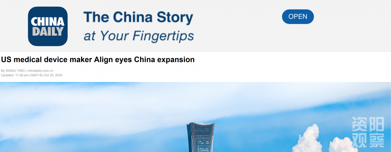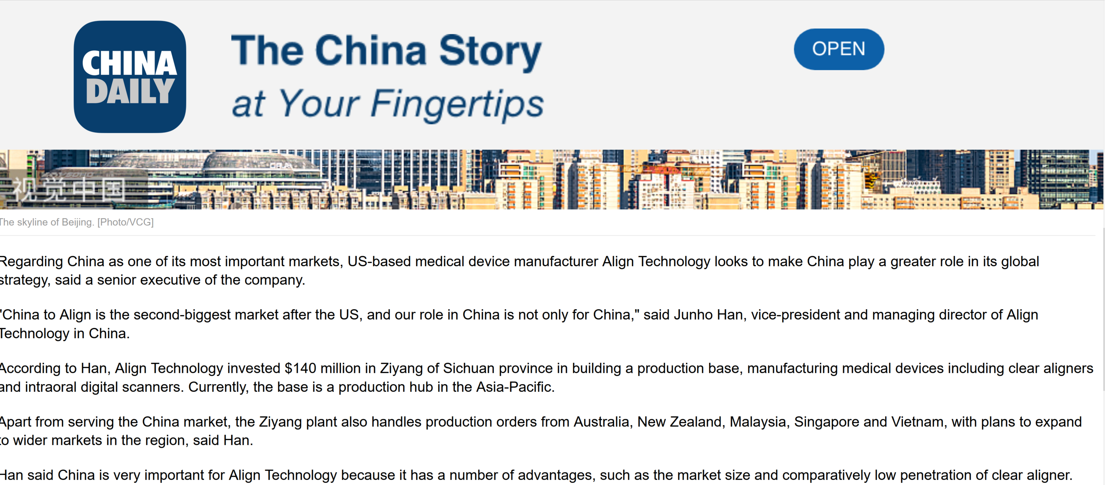 10月25日,中国日报网刊发了标题为:US medical device maker Align eyes China expansion(美国医疗器械制造商Align在中国扩大生产)的文章,讲述了爱齐科技资阳工厂的建设情况。文中提到:2017年11月,爱齐科技投资1.4亿美元在“中国牙谷”四川资阳投资建厂,生产隐适美定制式矫治器和iTero口腔数字印模仪。2020年9月,资阳全新生产基地占地120亩,建筑面积约3.2万平方米,这一大规模生产制造基地代替了之前的临时工厂,其建立极大程度上优化了生产和交付时间,更好地服务本土客户和患者。目前,资阳工厂的产能已覆盖了澳大利亚、新西兰、马来西亚、新加坡、越南等国家的生产订单。未来,资阳工厂还将进一步扩大生产范围,覆盖包括韩国在内的更广泛亚太市场的生产需求。