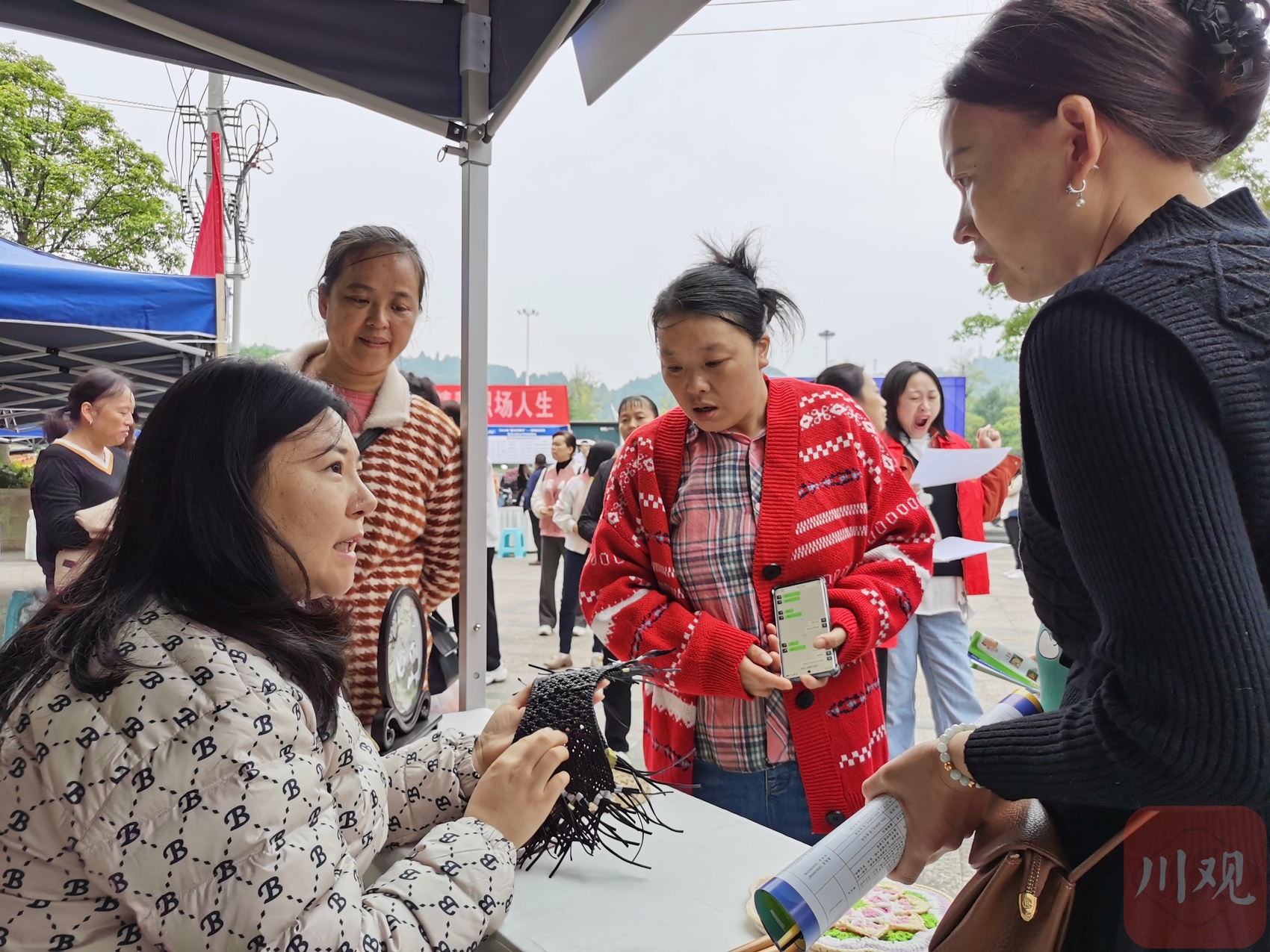 招聘会现场,还有不少家庭主妇在寻找上班时间灵活的岗位。今年50岁的罗永恒想找一份早上8点后上班,下午5点能下班的工作。对此,乐至县永立职业技能培训学校的手工编织业务吸引了罗永恒的注意。“我们提供材料,你可以拿回家做,根据做的数量和工艺来算钱。”不少手工编织者通过编制草编鞋、蜀绣等获取报酬,技术过硬的每天可收入上百元。