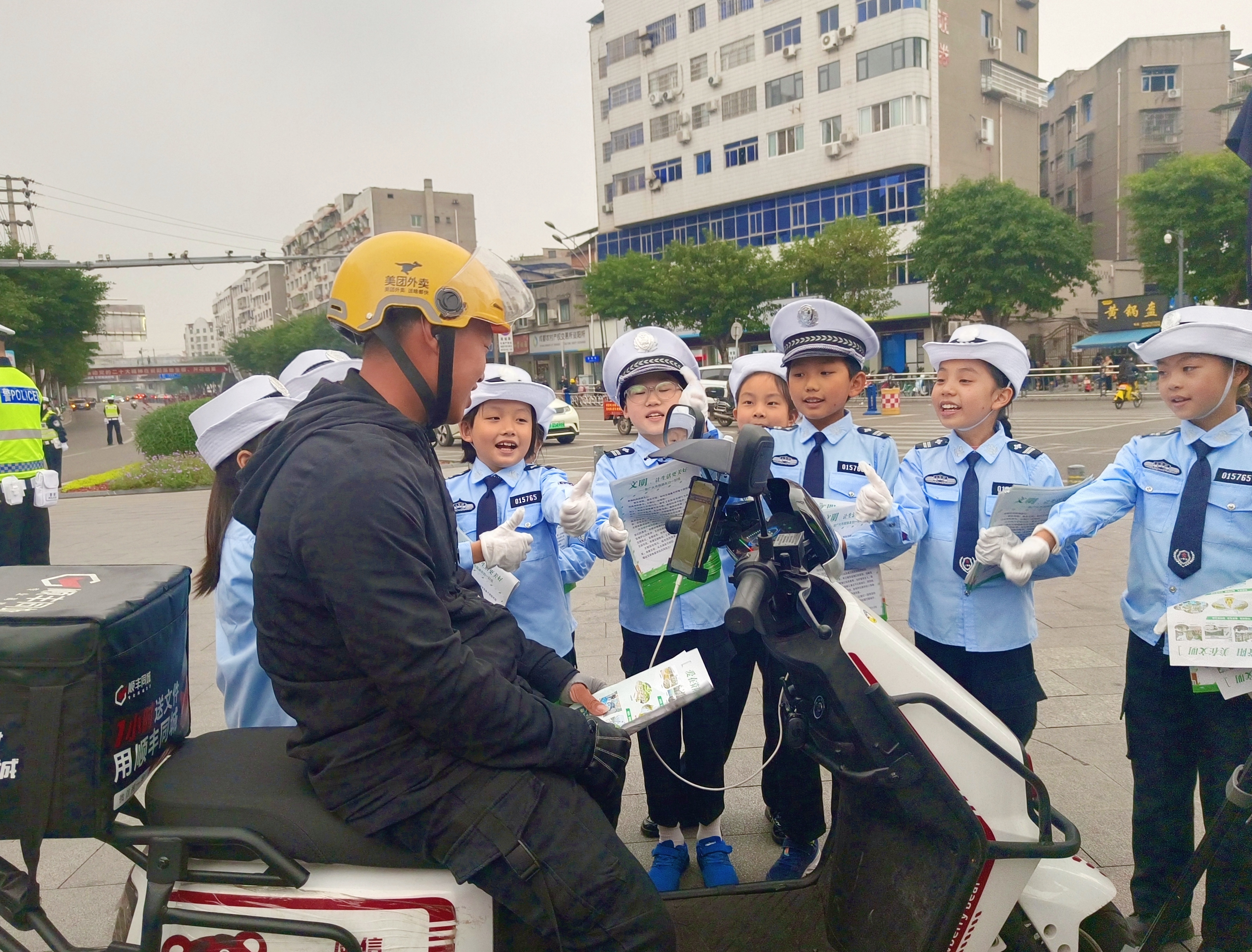 “阿姨,请戴好头盔!”在路口,电动车来回穿行,“小交警”们用洪亮的声音“喊话”,并发放安全交通宣传资料,吸引不少市民的目光,增强市民的交通安全意识。