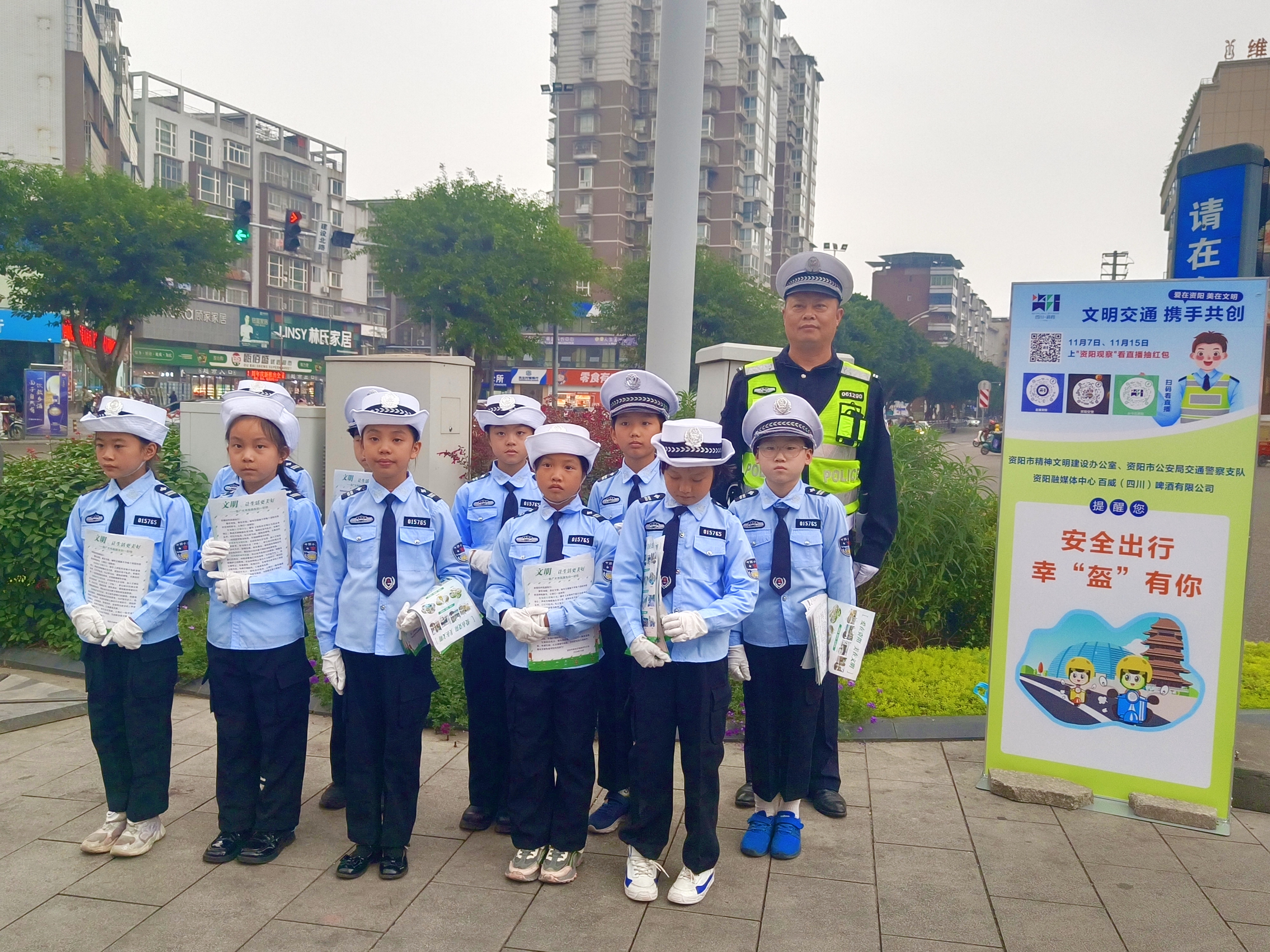 而在线下,雁江区海峡路口同样热闹非凡。一群身着蓝色制服、朝气蓬勃的“小交警”在交警的悉心指导下,热情洋溢地为交通安全代言,为文明出行助力。