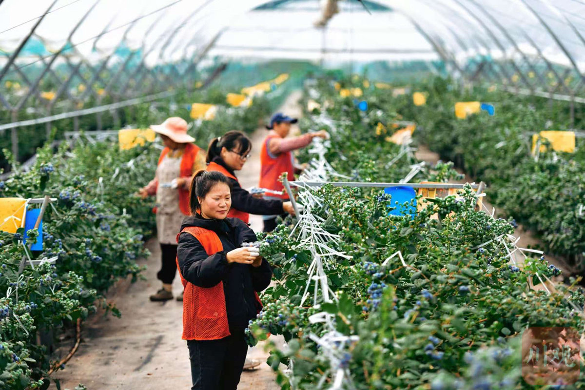 凉山州会东县蓝莓现代农业产业园区,工人们正在采摘大棚忙碌。
