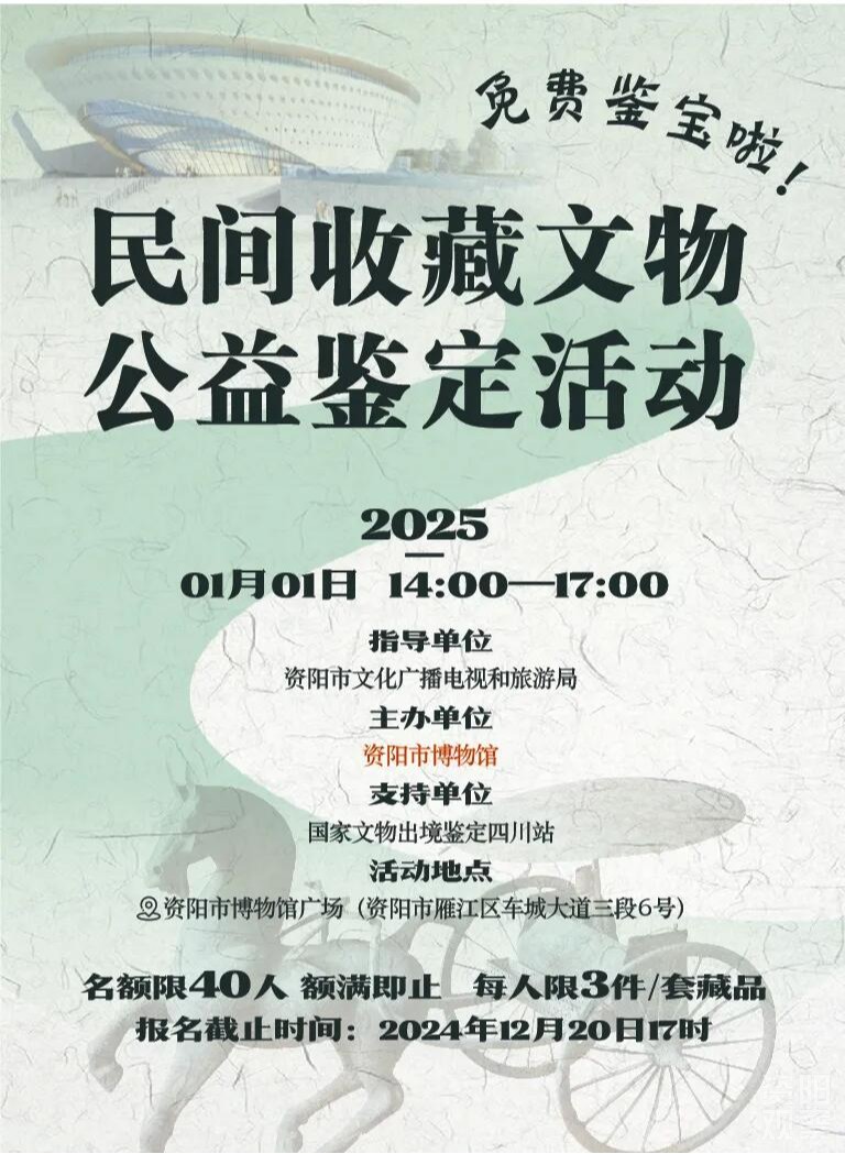 日前,资阳市博物馆发布公告,2025年1月1日,资阳市博物馆将联合国家文物出境鉴定四川站举办民间收藏文物公益鉴定活动。活动报名时间为即日起至2024年12月20日下午17时止,鉴定名额为40人,名额有限,额满即止,每人送鉴文物不超过3件/套。