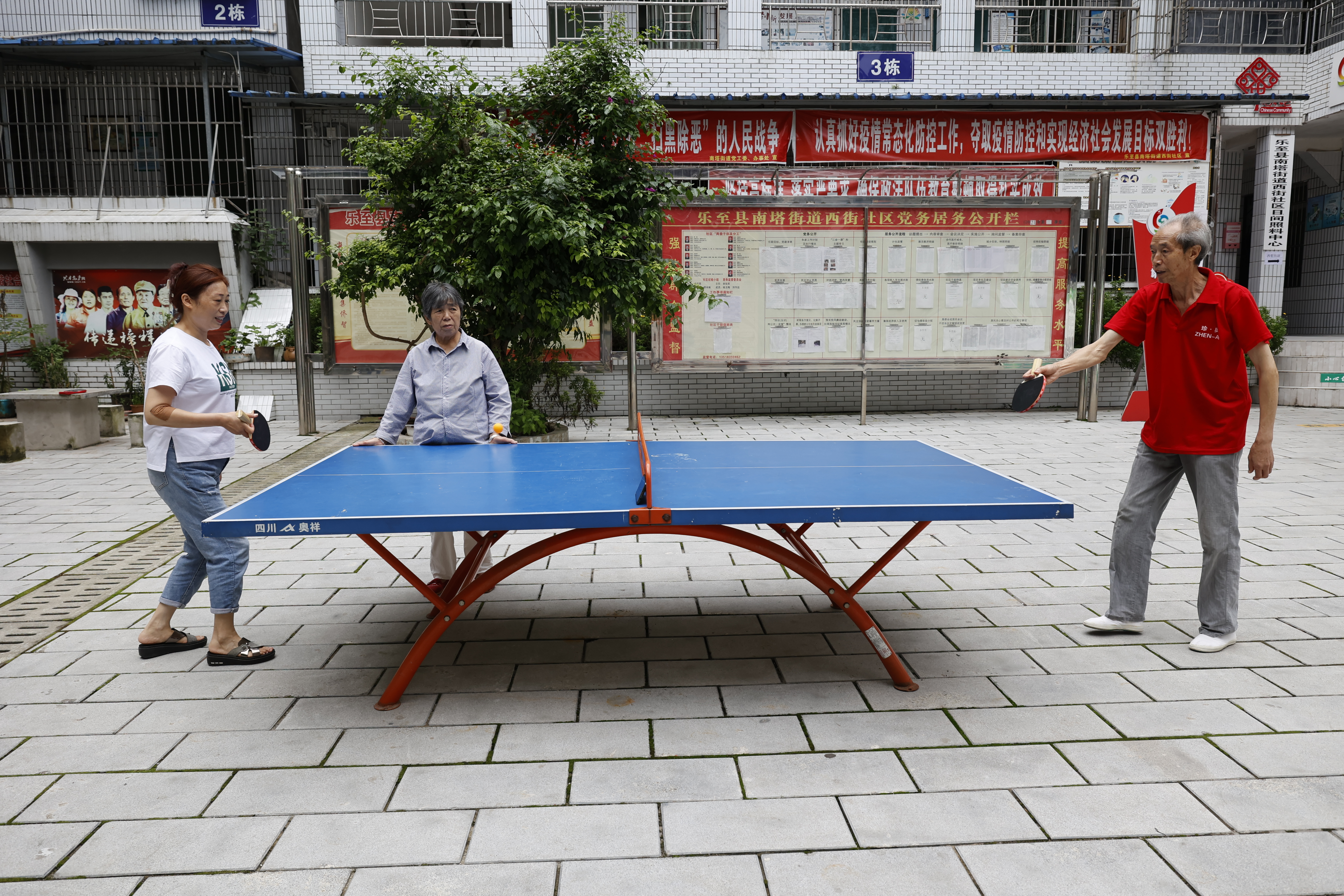 社区居民打乒乓球。