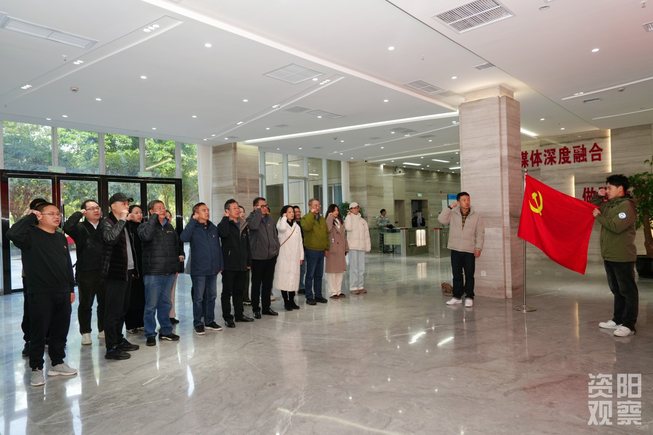 省广播电视学会党支部党员代表一行参观了资阳融媒体中心各功能区域设置,听取相关负责人对媒体融合改革工作情况介绍,双方党员代表重温入党誓词。