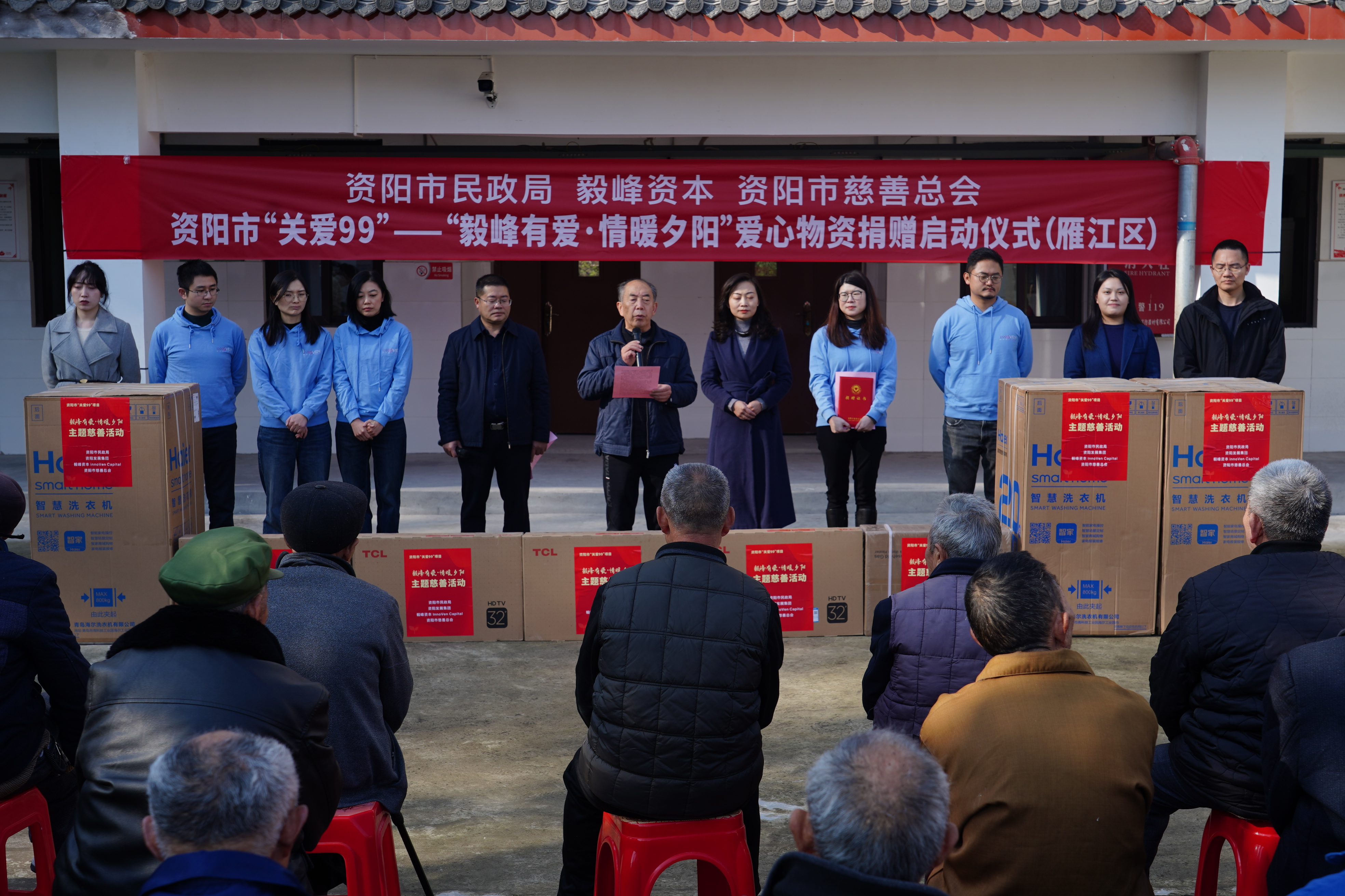 启动仪式上,毅峰资本为雁江区东峰镇、中和镇以及南津镇敬老院捐赠了洗衣机、电视机、热水器等爱心物资。市慈善总会负责人对爱心企业毅峰资本以及促成此次活动顺利开展的多家协调单位表达了诚挚感谢。