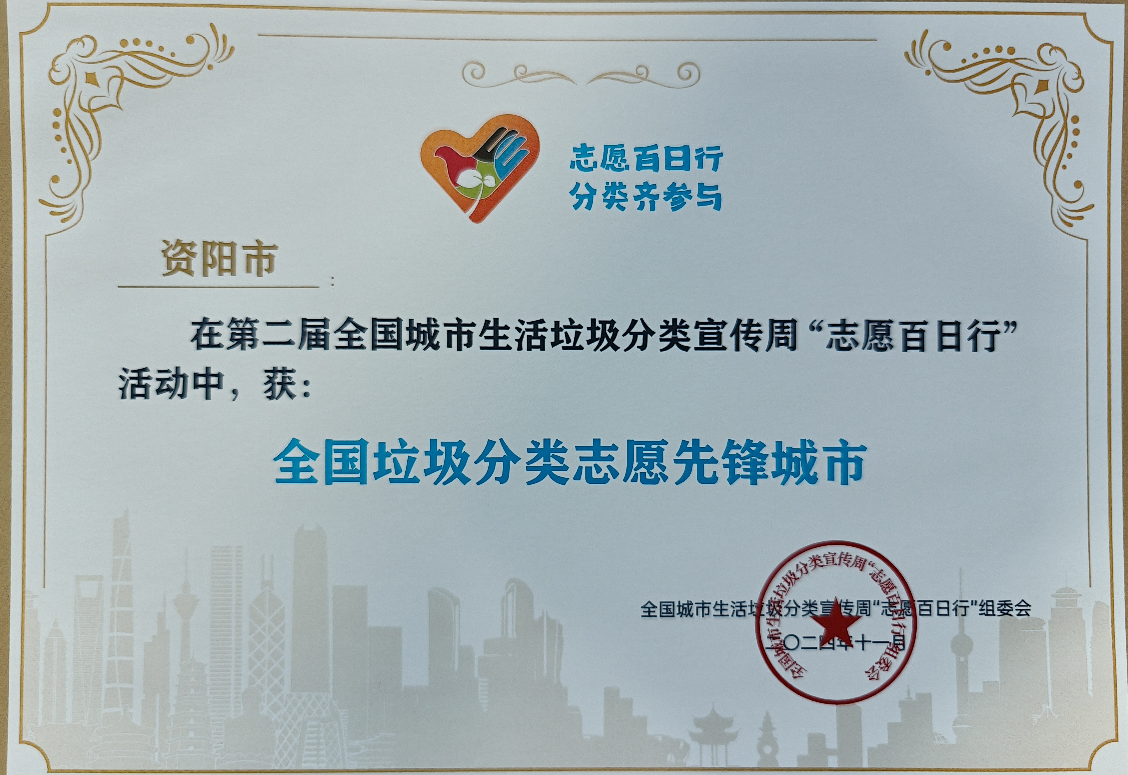 11月28日,第二届全国城市生活垃圾分类宣传周“志愿百日行”总结分享活动在深圳市举行,我市凭借出色表现,以排名第一的成绩荣获“全国垃圾分类志愿先锋城市”称号。这是资阳继2023年获得首届城市生活垃圾分类宣传周“全民齐点亮”活动全国城市一等奖、2024年第二届全国城市生活垃圾分类宣传周“分类达人说”全国冠军后,再次在垃圾分类领域斩获的国家级荣誉。