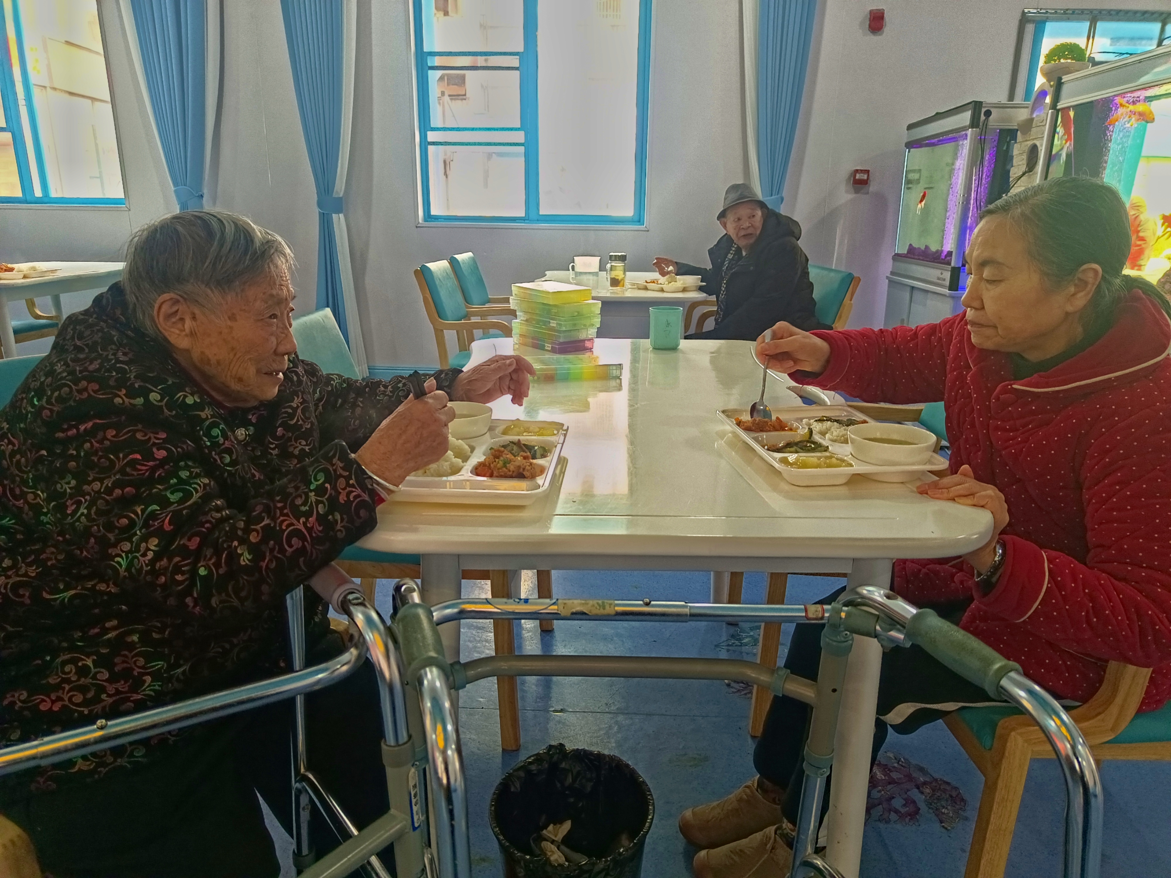 12月2日中午11点30分,服务中心的食堂内飘来诱人的饭菜香。“奶奶,喝点汤,慢慢吃!”在护理人员的照料下,老年人们纷纷围坐在餐厅用餐,有说有笑。