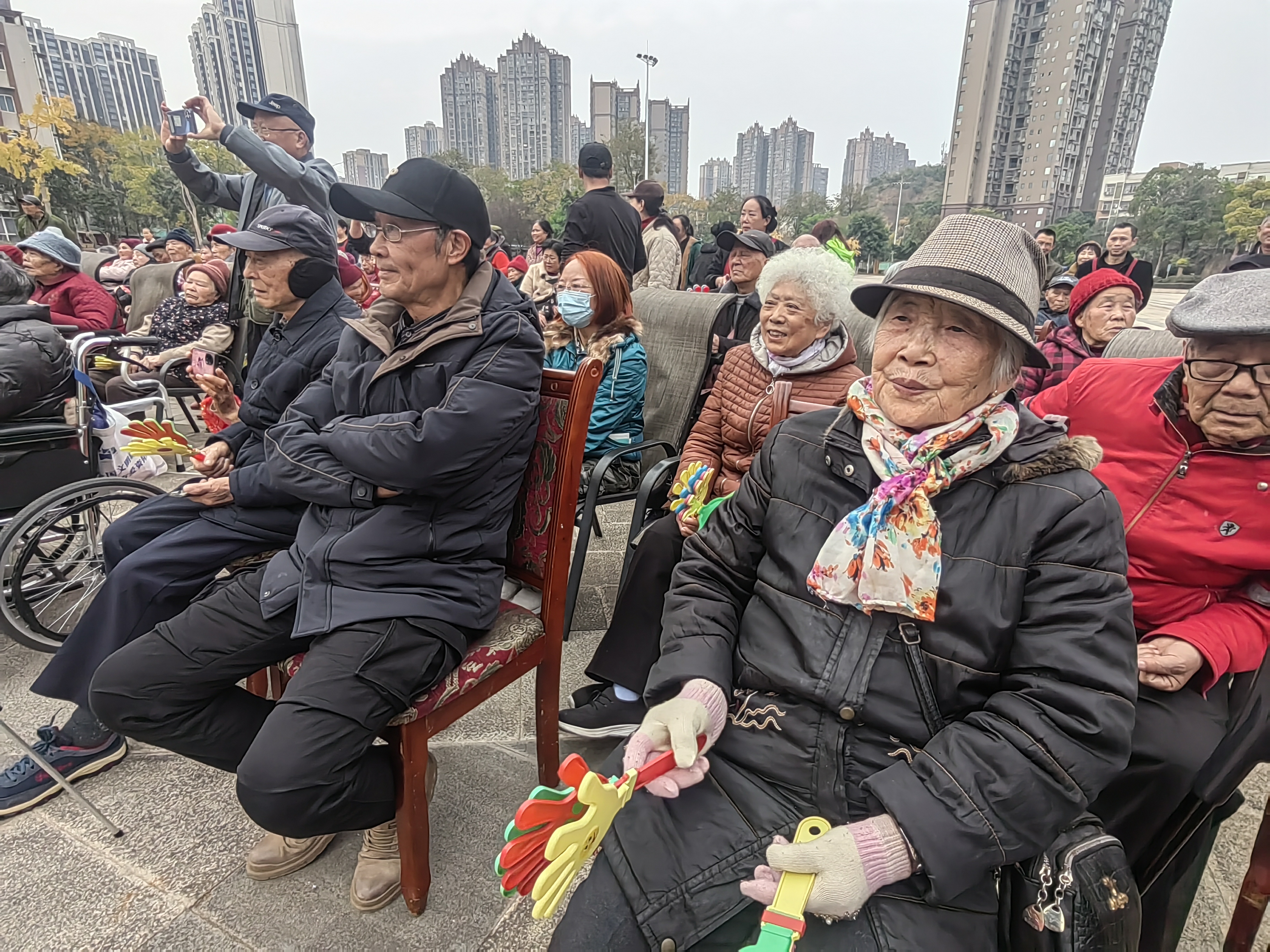 活动在舞龙舞狮中拉开帷幕,传统文化瞬间点燃了现场的气氛,紧接着舞蹈《彩绸舞》、川剧变脸、快板《美好生活》、腰鼓舞《张灯结彩》、大合唱《没有共产党 就没有新中国》等节目轮番登场,歌曲激昂,舞姿优美,志愿者不时与老人热情互动,老人们看得津津有味,其乐融融的氛围与精彩的演出交织在一起,台上台下充满欢乐。