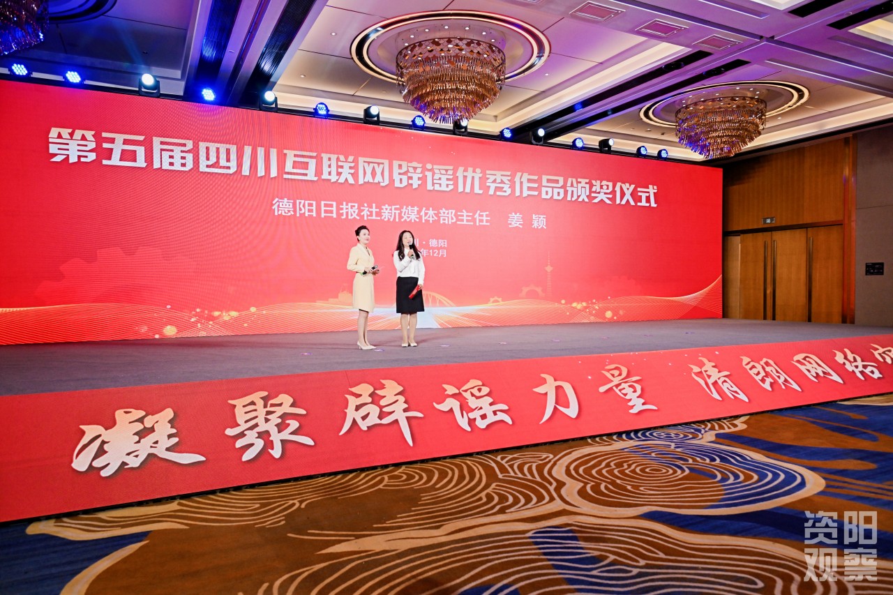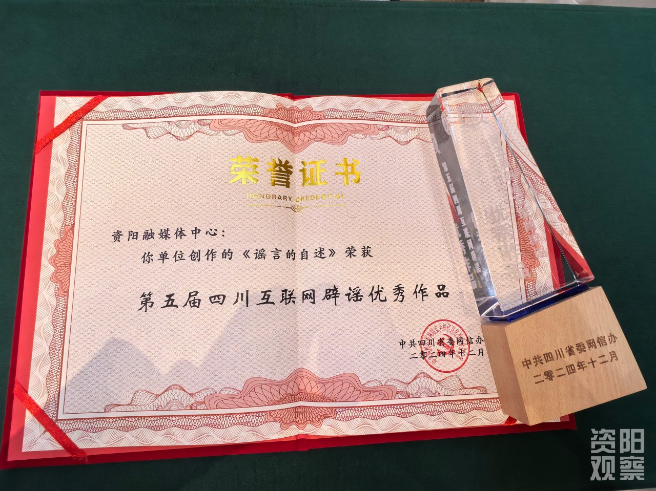 12月5日,以“凝聚辟谣力量 清朗网络空间”为主题的“第五届四川互联网辟谣优秀作品”颁奖典礼在德阳市举行。资阳融媒体中心创作的作品《谣言的自述》获图片类优秀作品。本次活动由中共四川省委网信办主办,四川省网络治理研究中心、中共德阳市委宣传部、封面新闻承办。