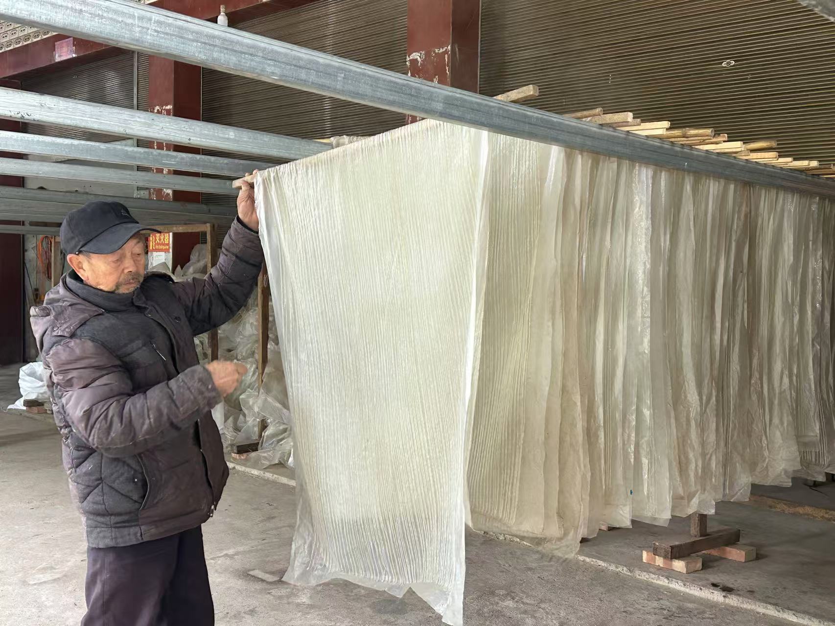 农户正在将刚制作出的粉条进行晾晒。