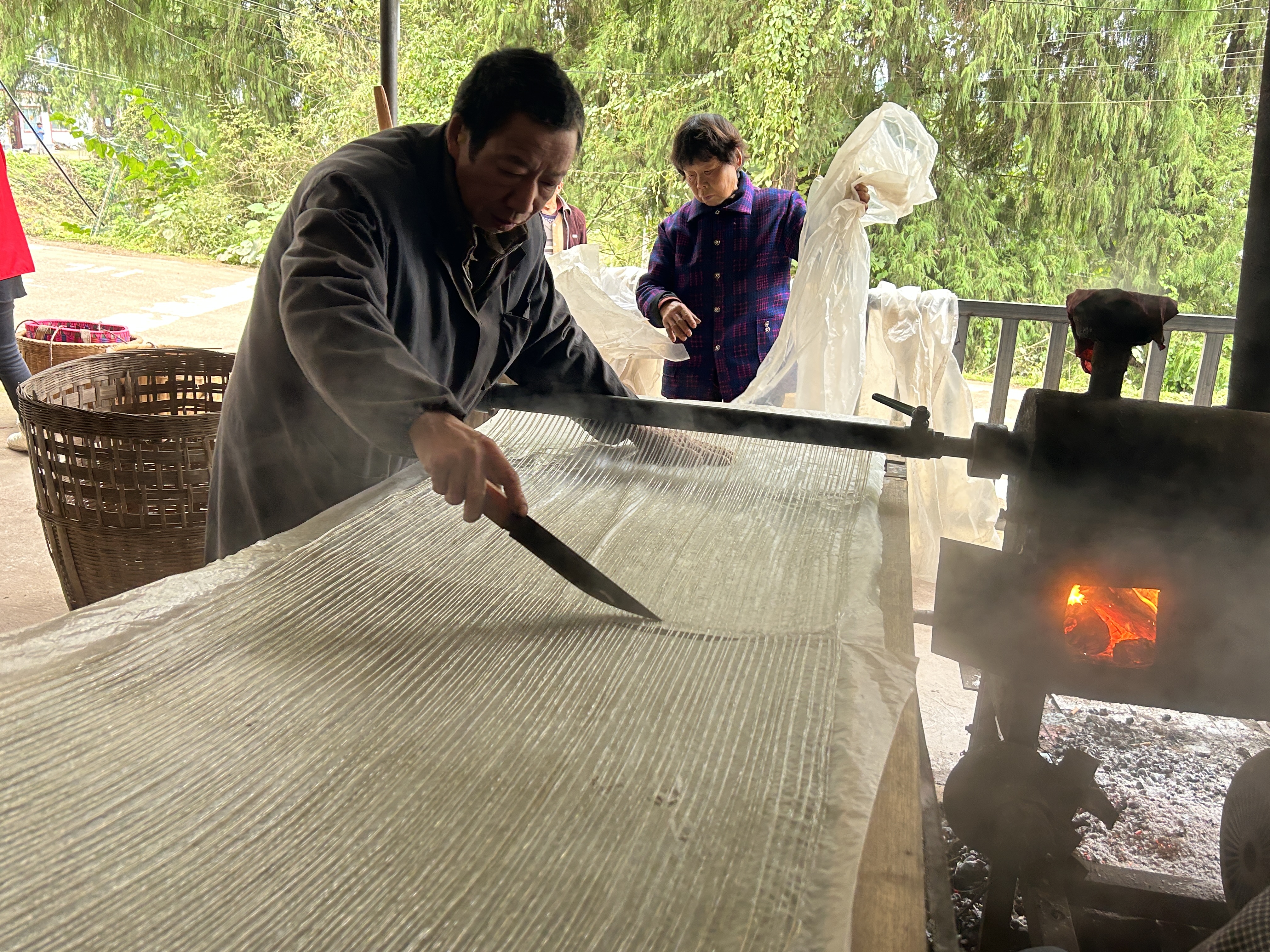 农户正在将刚制作好的粉条切成均匀的条段。