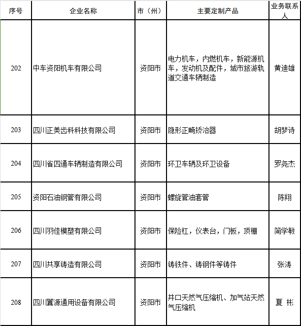 12月9日,省经济和信息化厅公布2024年定制化生产重点企业名单,确定四川轮胎橡胶(集团)股份有限公司等208户企业为四川省2024年定制化生产重点企业。其中,中车资阳机车有限公司、四川正美齿科科技有限公司等7家资阳企业上榜。