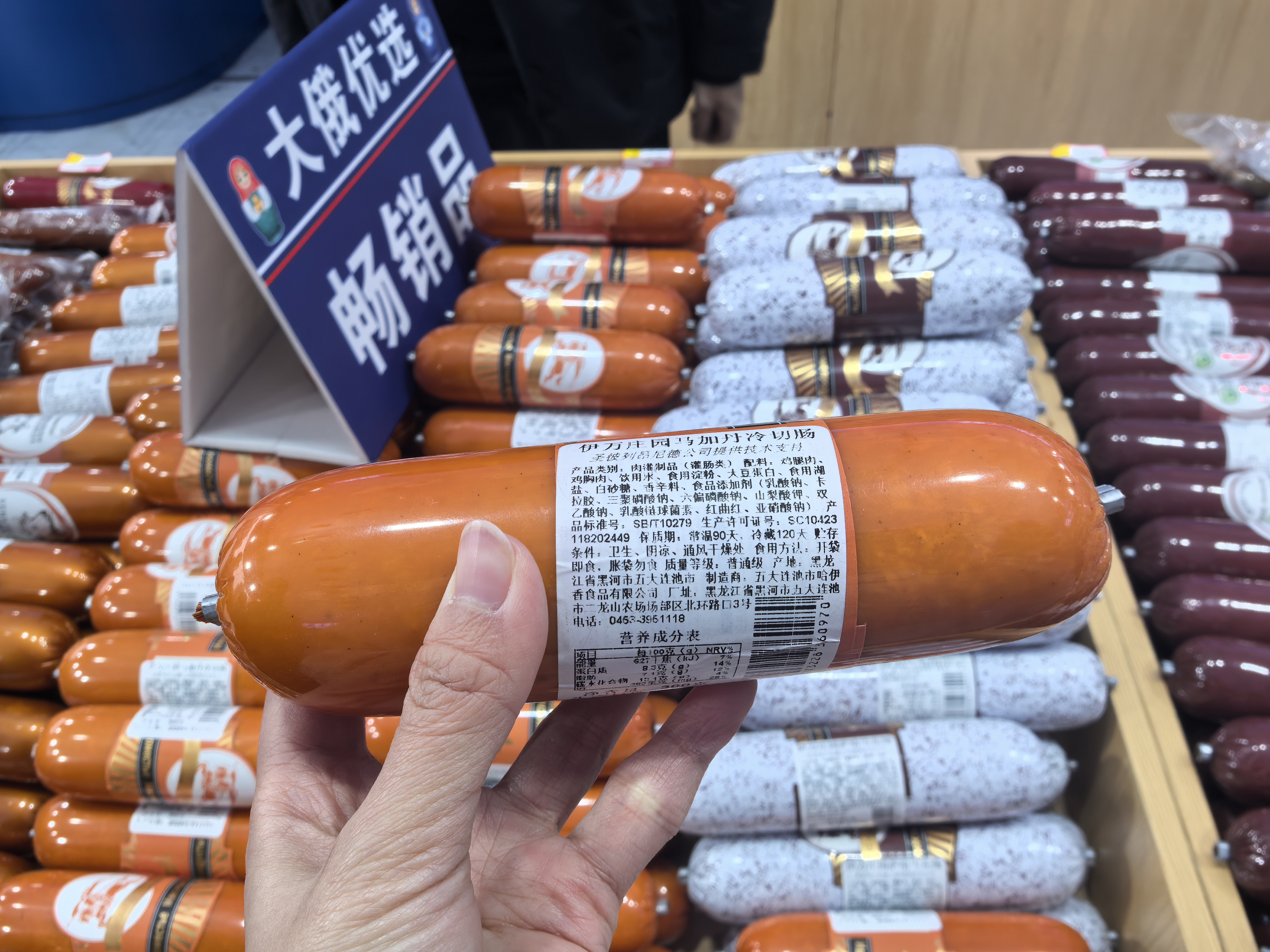 可仔细端详,蹊跷之处也不少。就拿门口摆放的那10余种香肠来说,产地一栏明晃晃地标着“黑龙江”,并非大众预想中的俄罗斯。可谓远看“俄味十足”,近看却是“中国制造”。