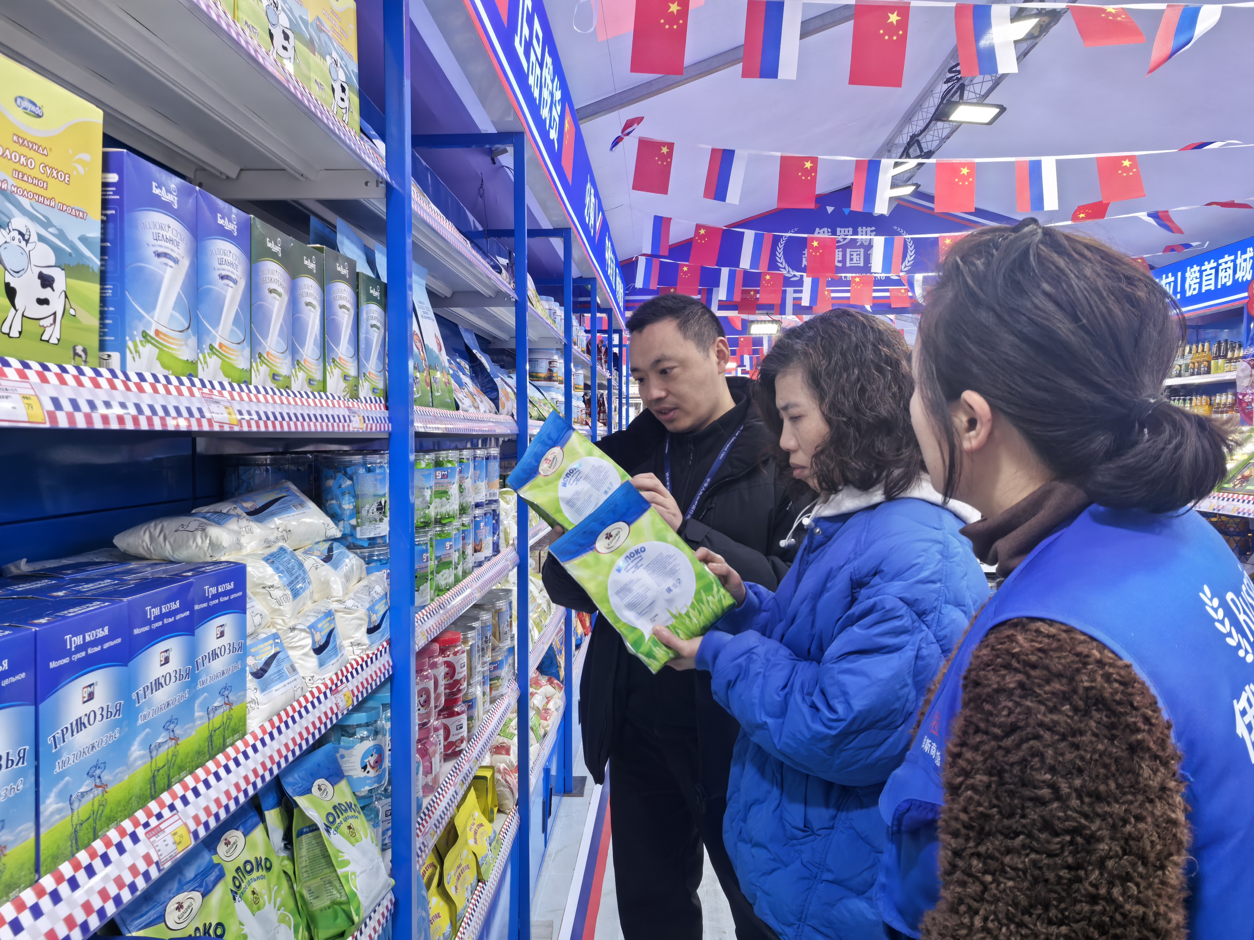 店内更是一片琳琅满目的景象,几百上千种商品堆叠摆放,从精致包装的巧克力、造型各异的伏特加酒,到印着俄罗斯特色图案的各类饼干、奶粉、香肠等,一应俱全。