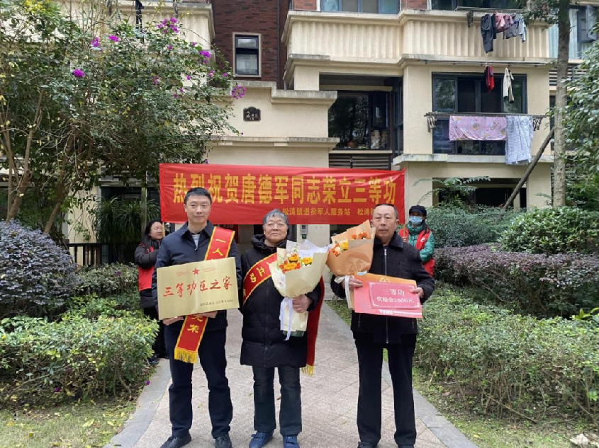 为弘扬拥军优属光荣传统,营造关爱功臣模范的社会氛围,近日,高新区松涛镇、社事局、红岩子社区联合组成慰问小组,为荣立三等功的退役军人唐德军及家属送上“三等功臣之家”牌匾、立功喜报和慰问金,传递党和政府的关怀与温暖。