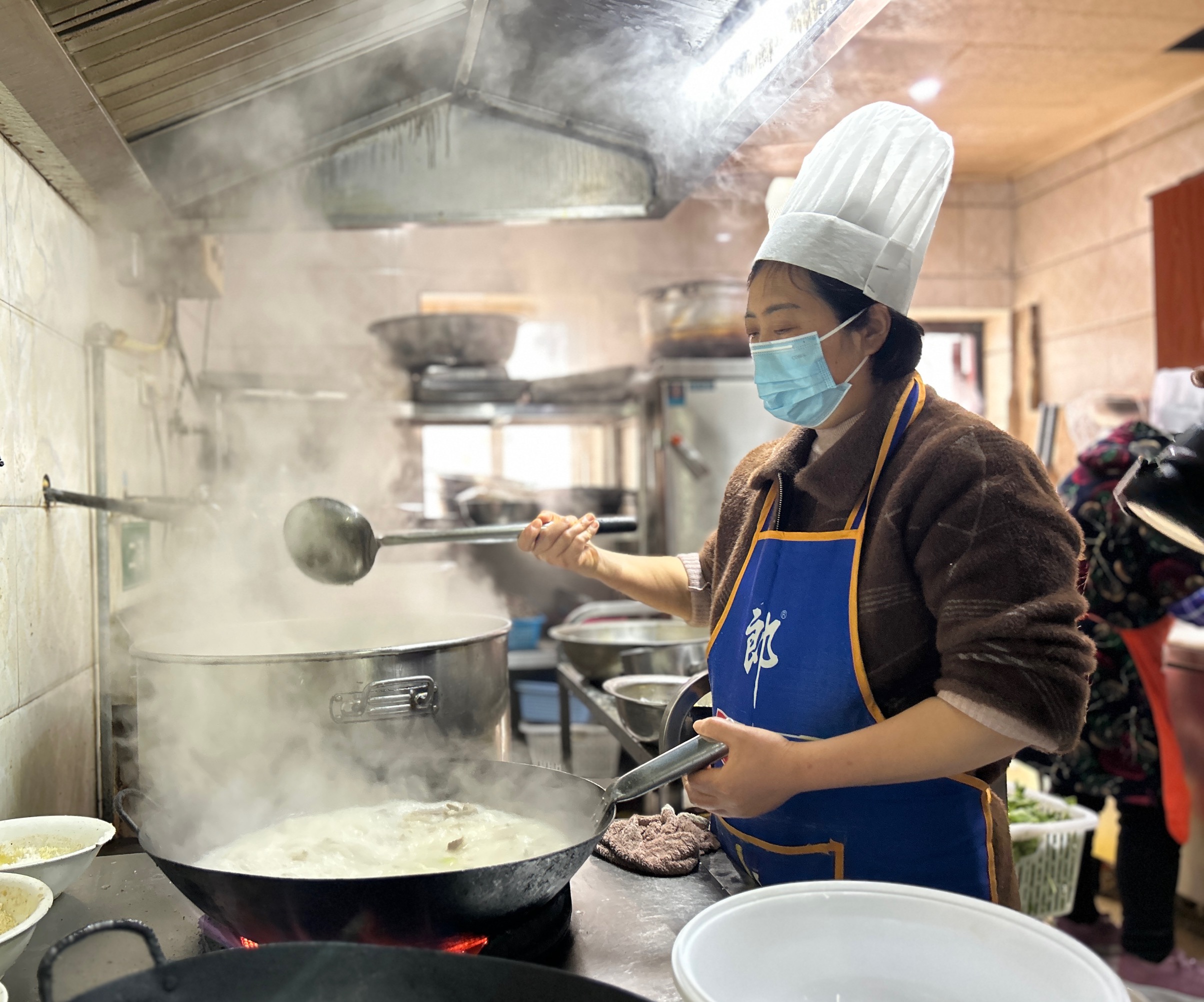 烟雾缭绕中,一口铁锅架在炉灶之上,摊主徐秋手起刀落间,将羊肉切成大小均匀的薄片,随后拿起一把长柄勺子,在锅中轻轻搅动,将羊肉均匀下入锅中,一股浓郁醇厚的热气扑面而来……