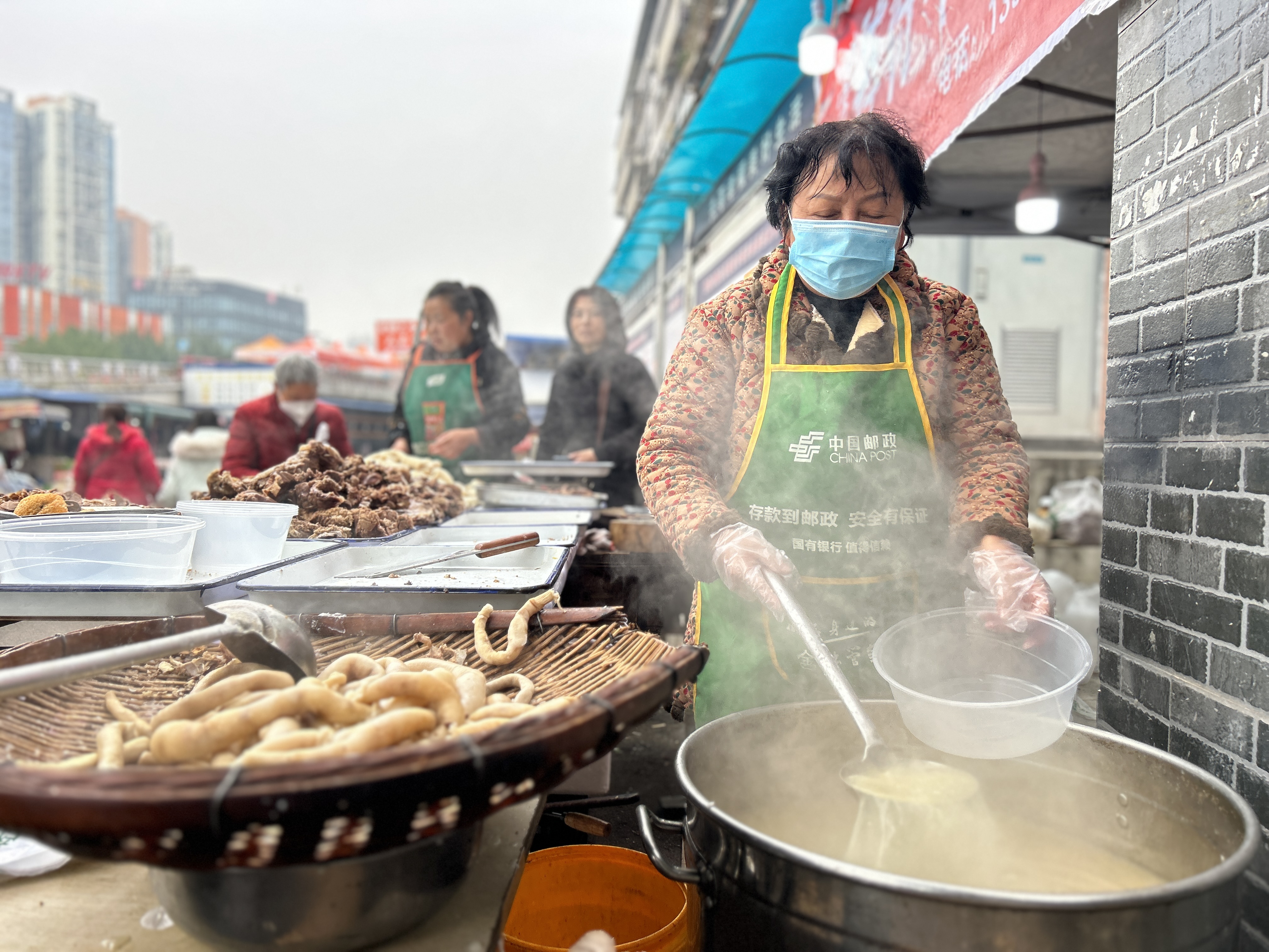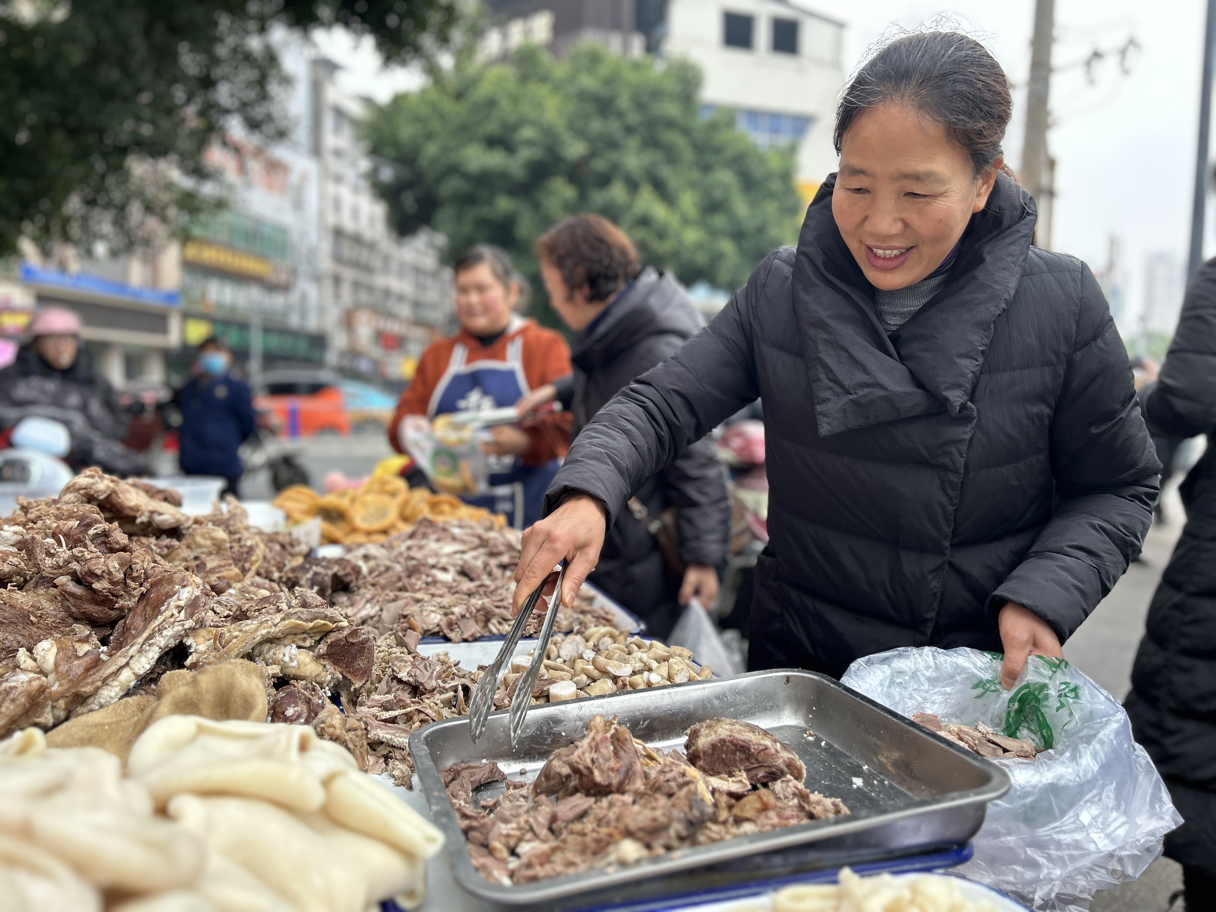 “羊肉、羊杂、油糕都买了点,冬至嘛,羊肉必不可少。”另一头,刚付完钱的陈静,提着一大盒羊汤满意地离开了人群。