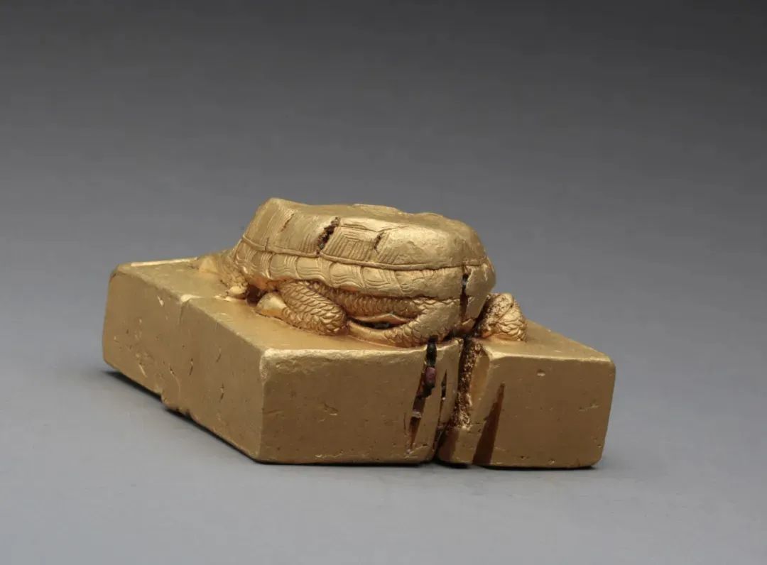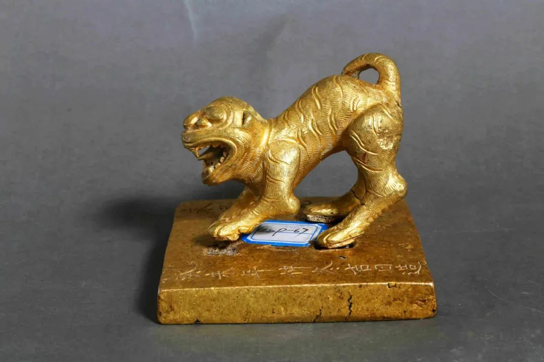 (虎钮永昌大元帅金印是“2014.5.1彭山区特大盗掘倒卖文物案”追缴的国家一级文物,发现时印钮与印台分离。该印由黄金制成,方形印台,虎形印纽,印章金光灿然,虎钮身姿矫健,是江口古战场遗址发现的核心文物,对考证遗址年代和性质极为关键。)