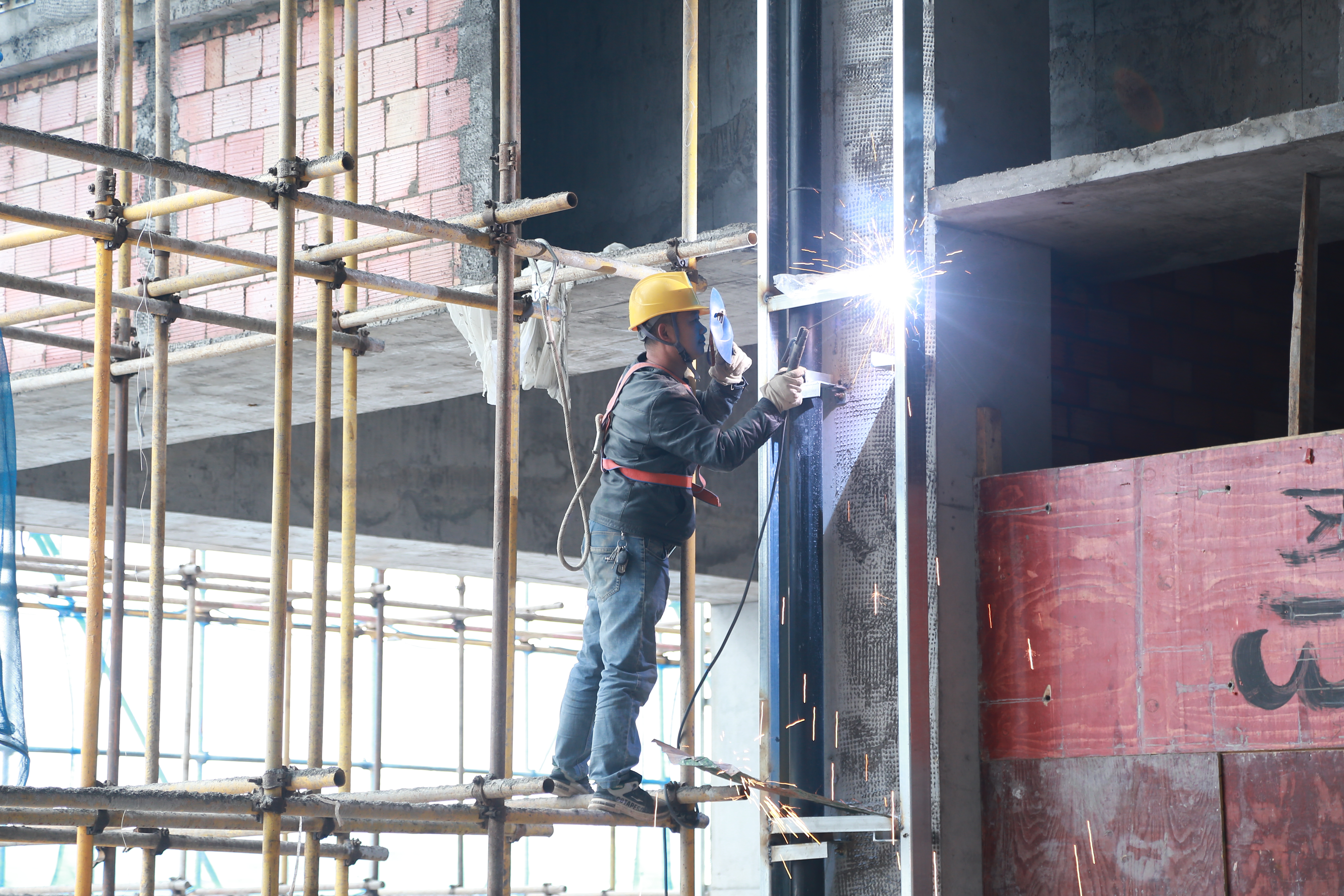 12月24日,记者走进该项目现场,虽然主体已经封顶,但依然能感受到那股紧张而有序的建设氛围。眼下,该项目的二次结构施工和装饰装修正在紧锣密鼓地进行着。市场大门幕墙钢结构焊接处火花四溅,外墙构造柱支模工作也有条不紊地开展。施工人员熟练地操作着各种工具,他们的身影在现场来回穿梭,或搬运材料,或专注施工,或相互协作。