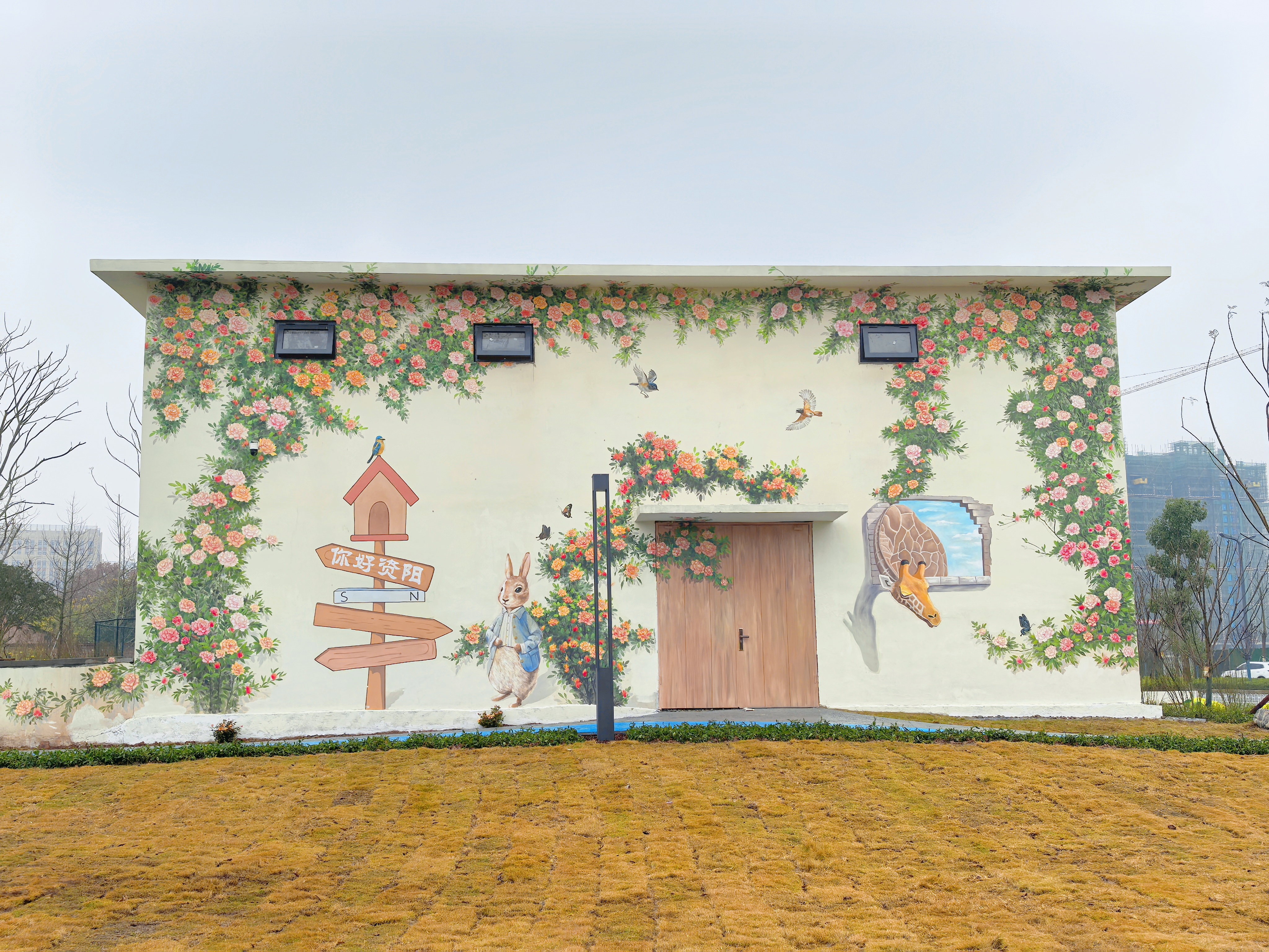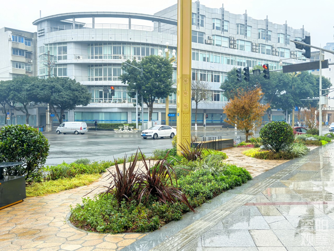 另一边,雨中的河堰嘴花园更是别有一番风情。园内绿植在雨水洗刷下更显翠绿,树木的枝叶随风摇曳。路旁的柱子上绘有美丽的花卉图案更添艺术氛围,给人带来宁静之感。