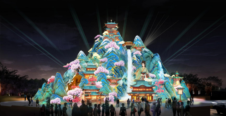 灯组结合了蜀山文化与晴雪元素,运用灯光、色彩和造型,营造出蜀山巍峨、飞瀑流泉、楼阁叠秀的绝美景致。灯组之上,点点“晴雪”纷扬洒落,宛如蜀山之雪穿越时空飘临锦官城,诗意氤氲弥漫。