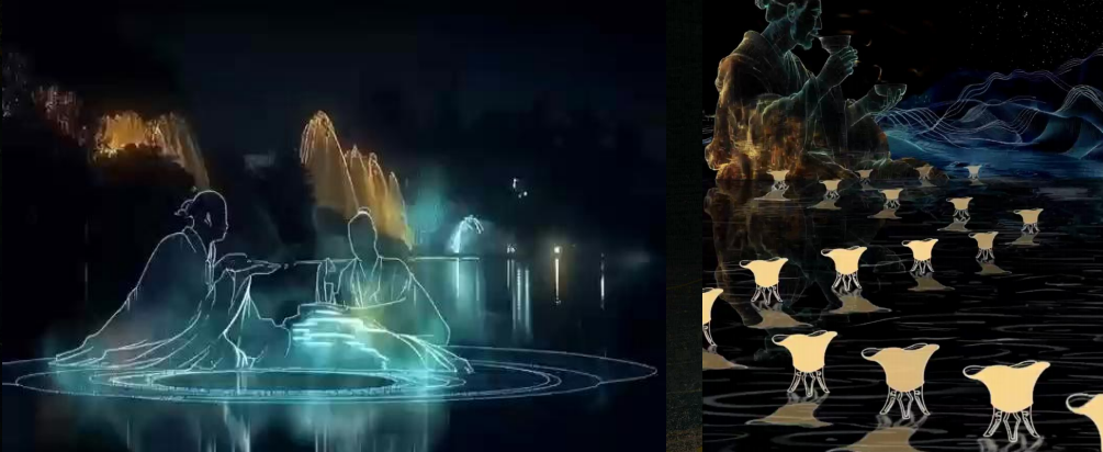 以水幕为媒介,联结李白、杜甫等诗人与成都的诗意羁绊。写意发光国画勾勒灵动人物,再现诗人于山水间畅饮、寄情天地之景,尽显巴蜀悠然。水幕光影携手“曲水流觞”无人船阵列,虚实碰撞,观众仿若穿越列席古代诗酒盛会,与诗人共品浪漫,沉浸在诗酒山水里,体悟时代风姿。