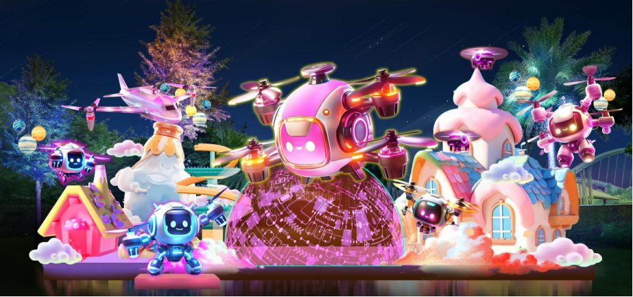 灯组聚焦“低空经济”,萌态熊猫巧融无人机造型,轻盈地穿梭在烟火缭绕的城市街巷上空,仿若来自未来的灵动使者。光影蹁跹,如梦幻妙笔,细腻绘就“低空经济”蓬勃盛景,尽显产业繁荣活力。