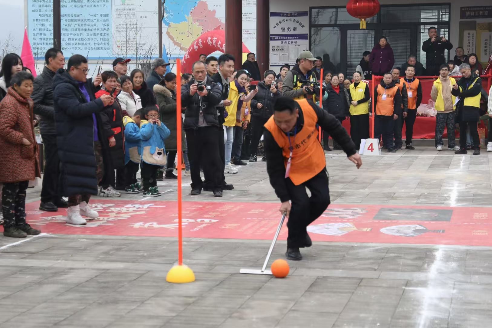 其中,川渝农民趣味体育赛是此次活动的重头戏。活动主办方安排了具有乡村特色的挑箩筐运送粮食、赶猪跑、扭扁担等比赛内容,吸引了来自隆昌市和重庆市荣昌区毗邻的部分镇(街道)的100余名返乡农民工、部分村社干部参与。尤其贴近农民群众日常生活的健身项目赶“猪”跑比赛,活动主办方将小猪改为小球,将日常赶猪用的竹竿改为了不锈钢推杆,不仅增加了比赛的难度,也让比赛妙趣横生。返乡农民工刘佳兴致勃勃地体验了一把“赶猪跑”,50米的距离,这位常年在深圳务工的小姐姐依然能够轻松驾驭,“我觉得这个比赛很接地气,能够找到小时候从事农业生产的感觉。”与此同时,传统竹竿欢乐垂钓赛、中国象棋友谊赛、拔河比赛、迎新春健步走等,杀年猪、科学健身知识宣传、送春联等活动也吸引了十里八乡的村民参与其中,让村民感受到了浓浓的年味。