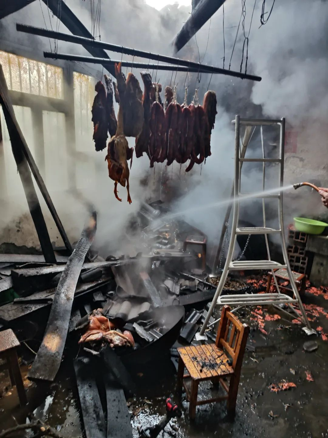 2025年1月11日,彭州市一夫妇在楼顶熏制腊肉,因操作不当导致香肠腊肉渗出的油滴在熏烤的树枝上,引燃了柏树枝,场面差点失控。所幸夫妻俩一阵慌乱泼水,浇灭了火源,没有酿成火灾事故。