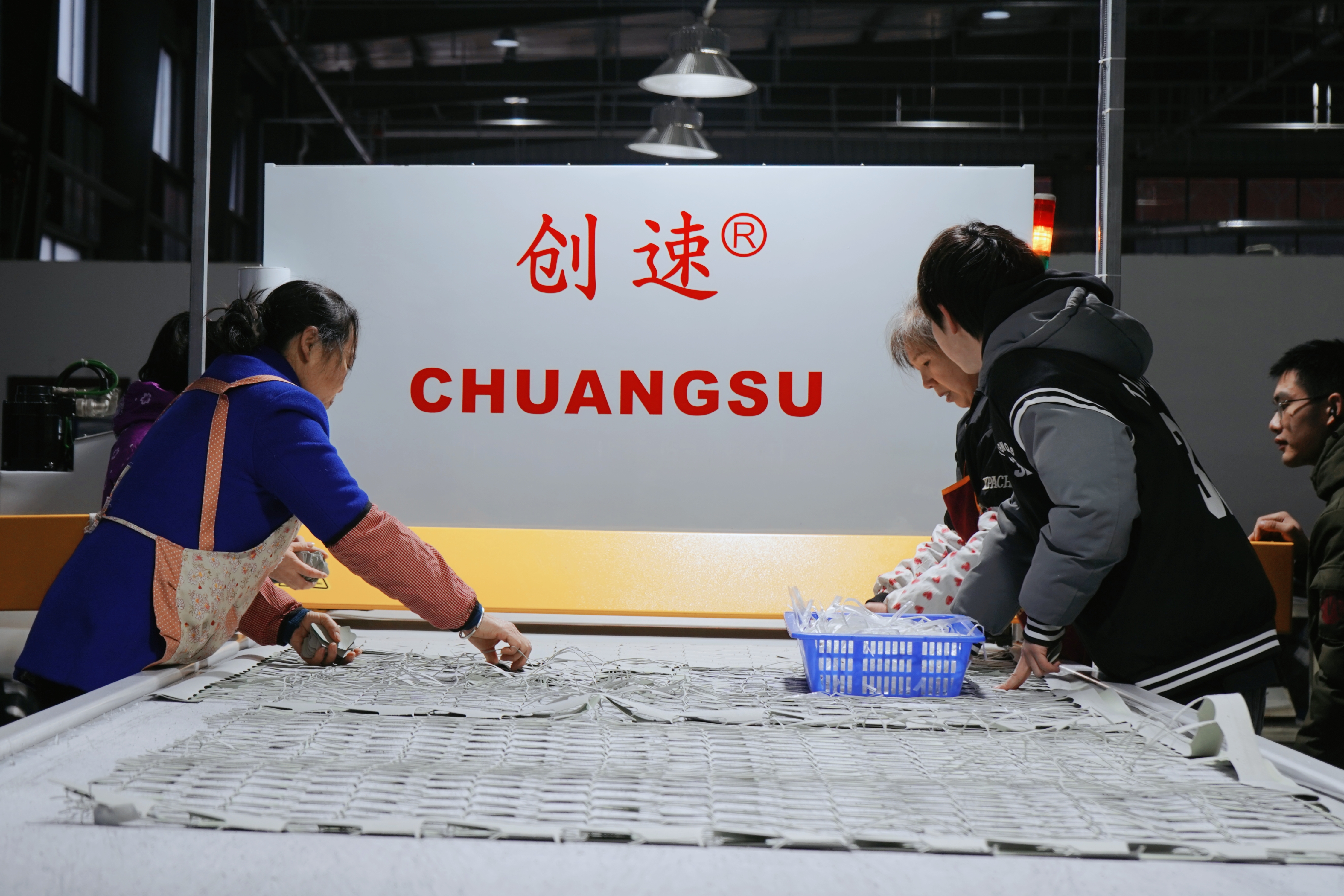工作人员正在使用自动裁断机生产。