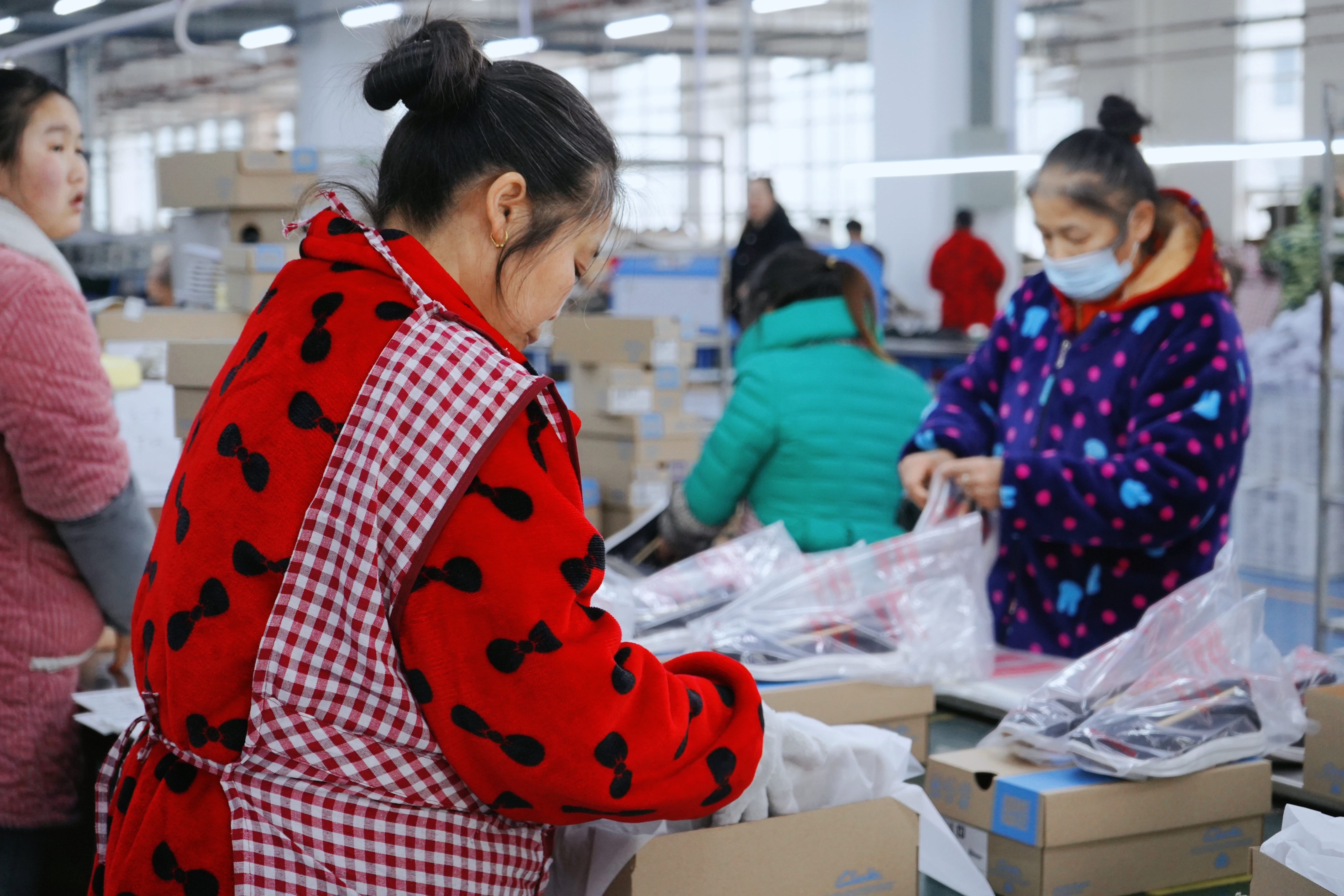园区制鞋工人正在包装成品鞋。