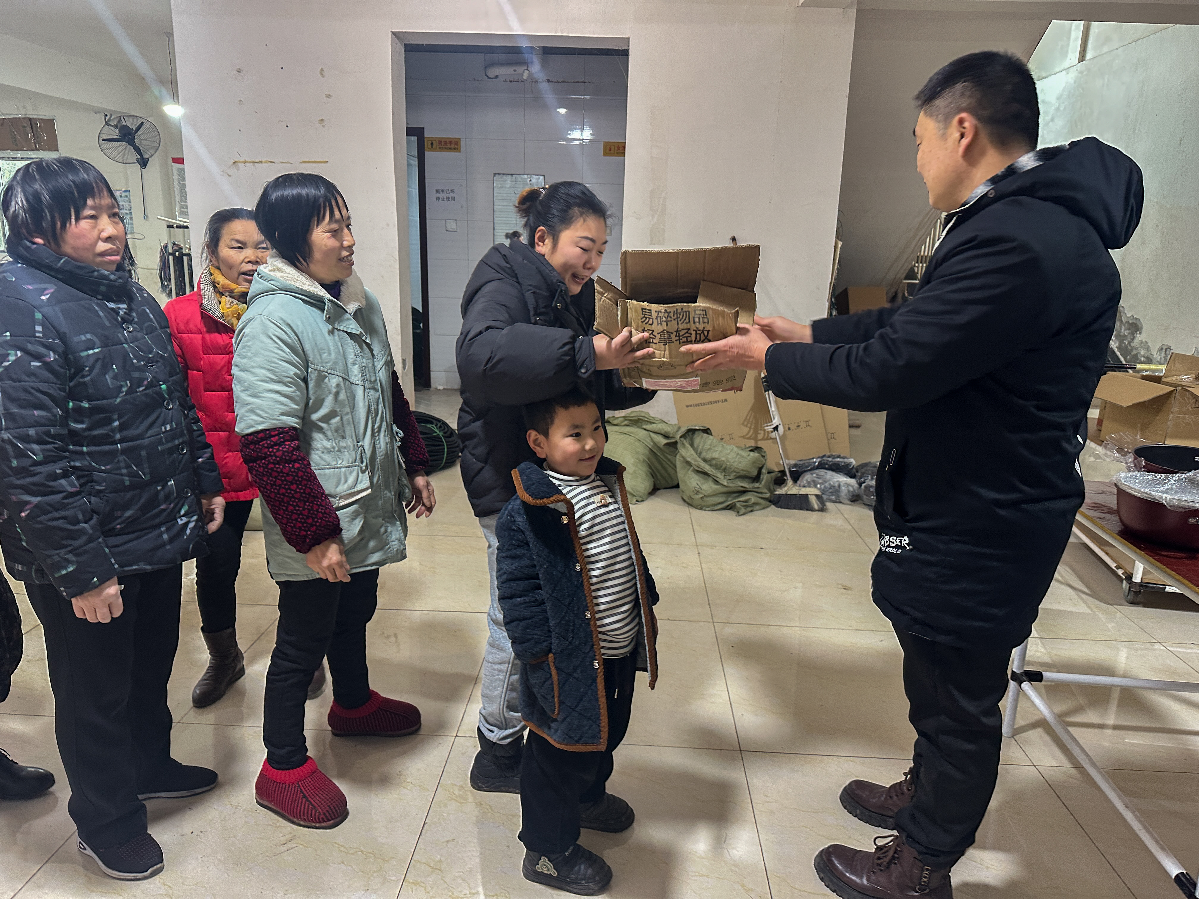 村党支部书记唐建平给工人们发新年礼物。