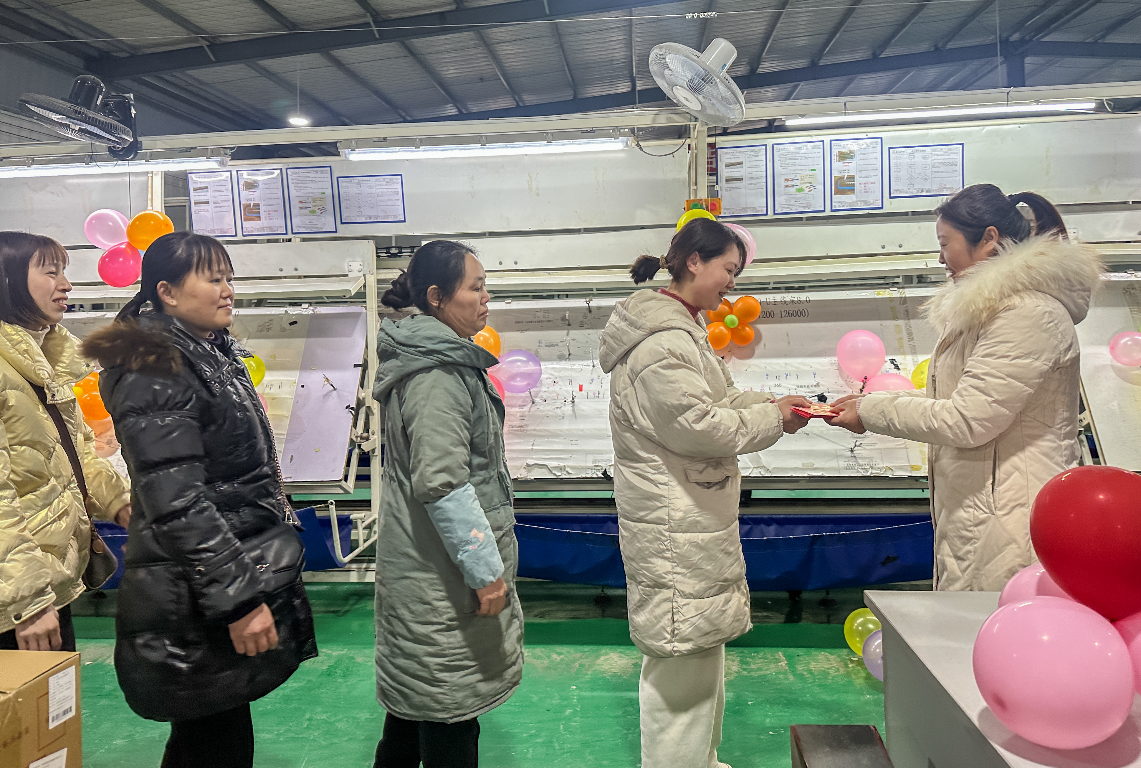 走进工厂,往常忙碌的生产车间,当天已被气球、彩灯、春联装扮得格外喜庆,数十张长条桌围成一圈,工人们并肩而坐,嗑瓜子、剥花生、唠家常,脸上笑容灿烂。
