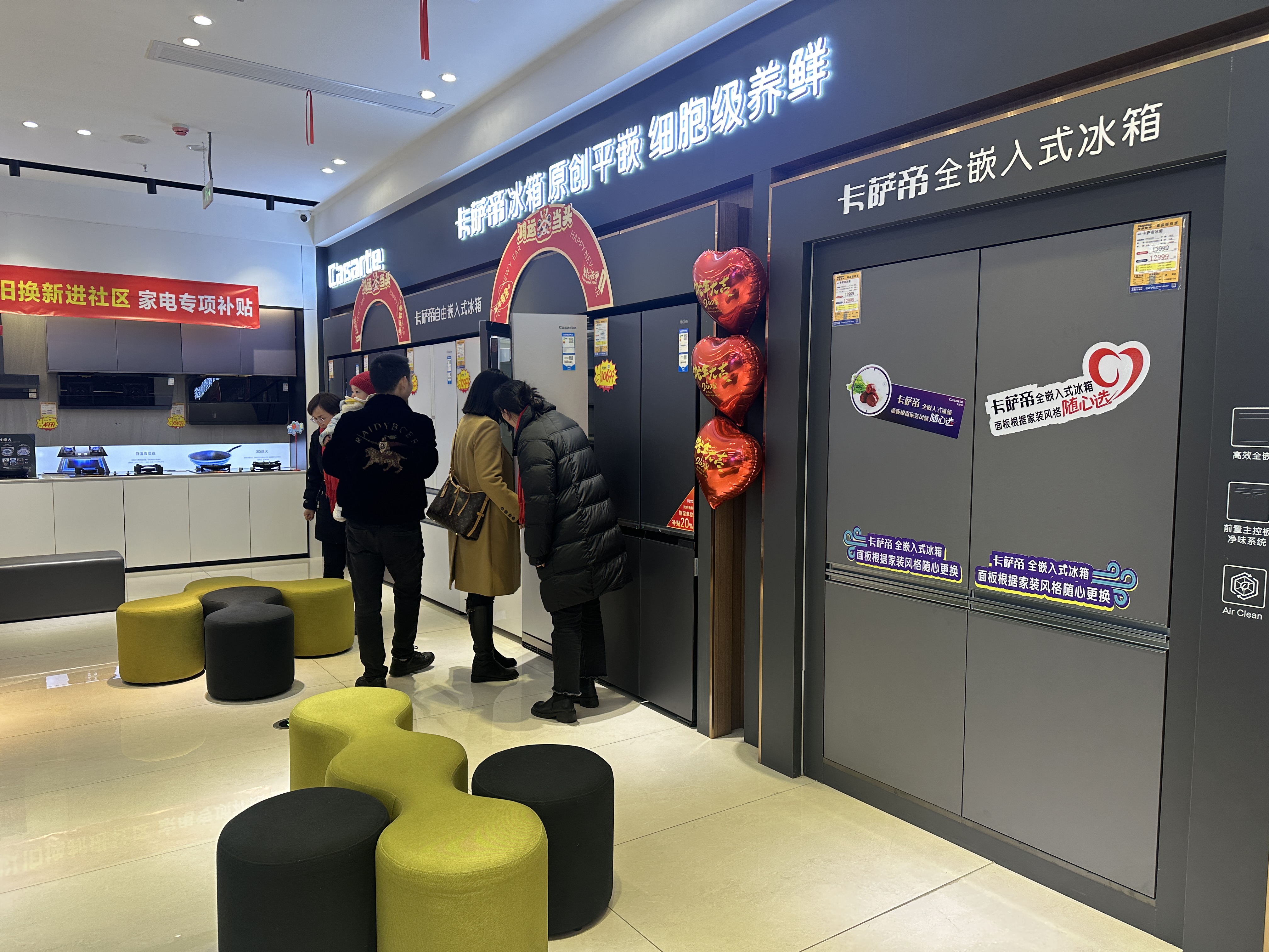 除了3C产品,家电产品同样热销。在百盛家电五交化有限公司(龙汇店),创维电视、美的抽油烟机、卡萨帝冰箱等产品琳琅满目,消费者精心挑选,整个商场充满着新年消费的欢快气息。