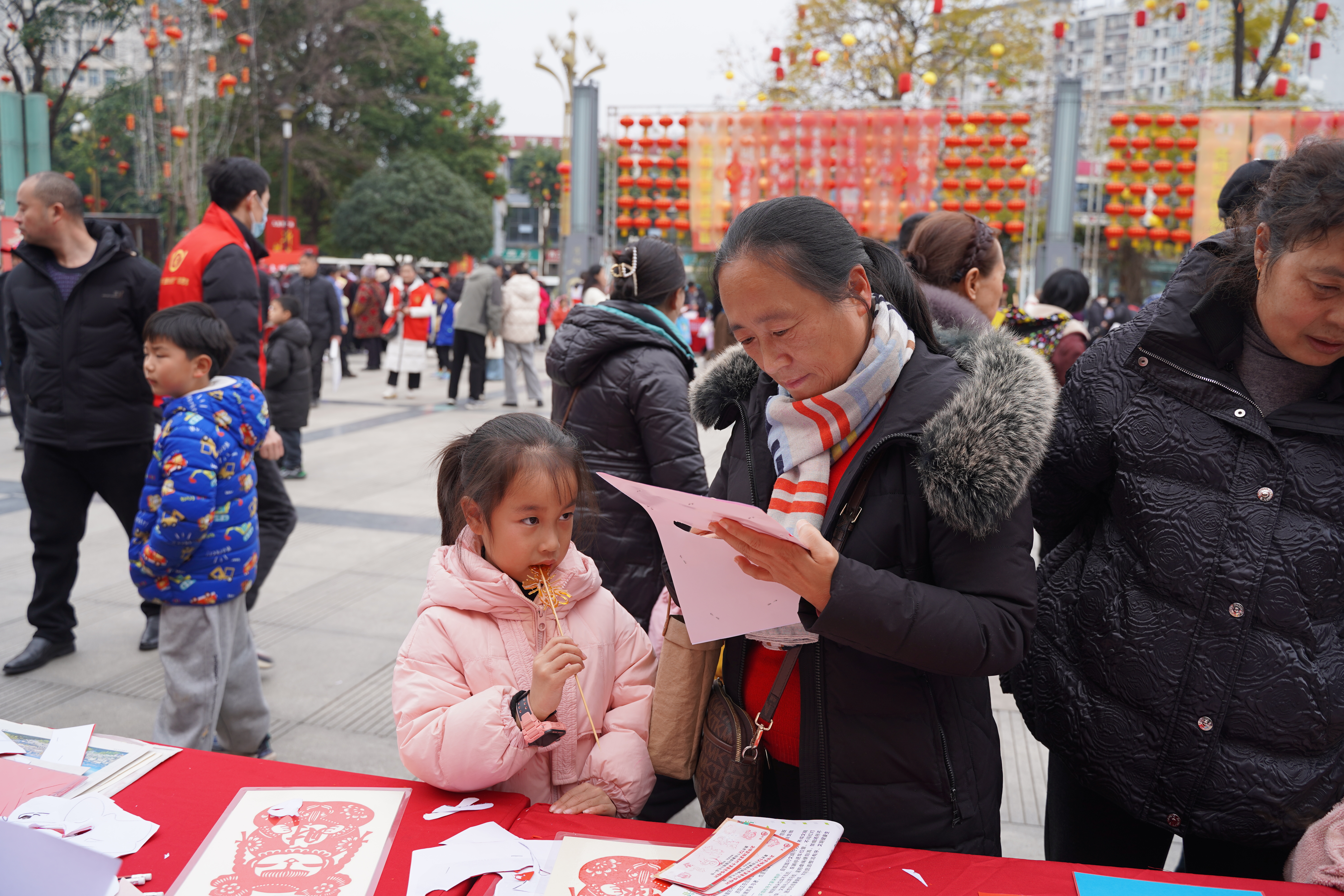 与此同时,另一旁的新春文明实践集市同样热闹非凡。在文明健康养成专区,医护人员耐心为市民提供爱眼指导、义诊、口腔科普和应急救援培训。在理论政策宣传专区里,普法、金融知识、防范网络诈骗等科普摊位前人头攒动,让市民在轻松氛围中提升认知。便民惠民服务专区人气爆棚,涵盖了安全宣传、公用服务咨询等贴心服务,极大方便了市民生活。在文明风尚引领专区,工作人员向市民倡导文明养犬、文明餐桌、垃圾分类等理念。优秀传统文化展示区的剪纸、糖画、绘制川剧脸谱、猜灯谜、面部彩绘同样令人目不暇接,增添了节日趣味。
