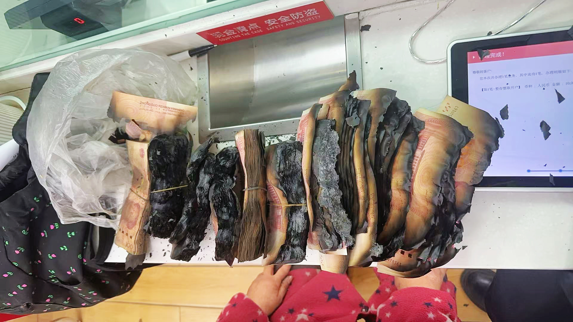 老人神色凝重地打开口袋,里面装着的是一张张被火烧过的纸币,满满一大袋。她着急地表示:“我的钱被火烧了,你们能不能帮帮我……”说话间,脸上满是沮丧。