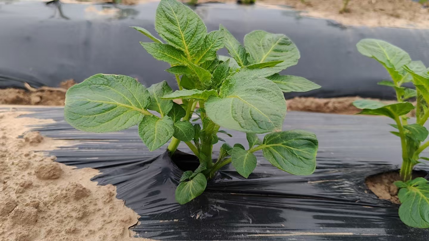 一片片覆盖着黑色地膜的土地整齐划一,农人们小心翼翼地在地膜上戳开一个个小孔,让嫩绿的土豆苗探出头来,沐浴温暖的阳光和春风。