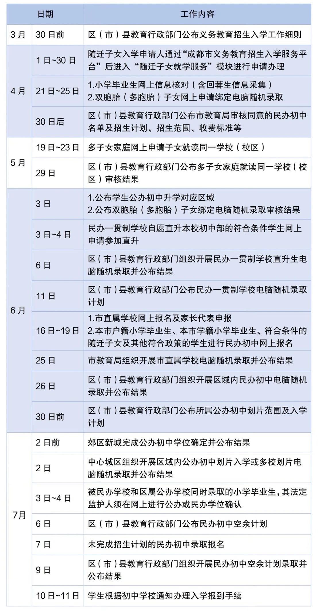 4月21日~25日,本市小学毕业生在“入学平台”进行信息核对(其中,如果您的孩子是随迁子女需于4月1日~30日,在“入学平台”中“随迁子女就学申请”申请);回蓉生进行信息采集;双胞胎(多胞胎)子女申请绑定随机录取。