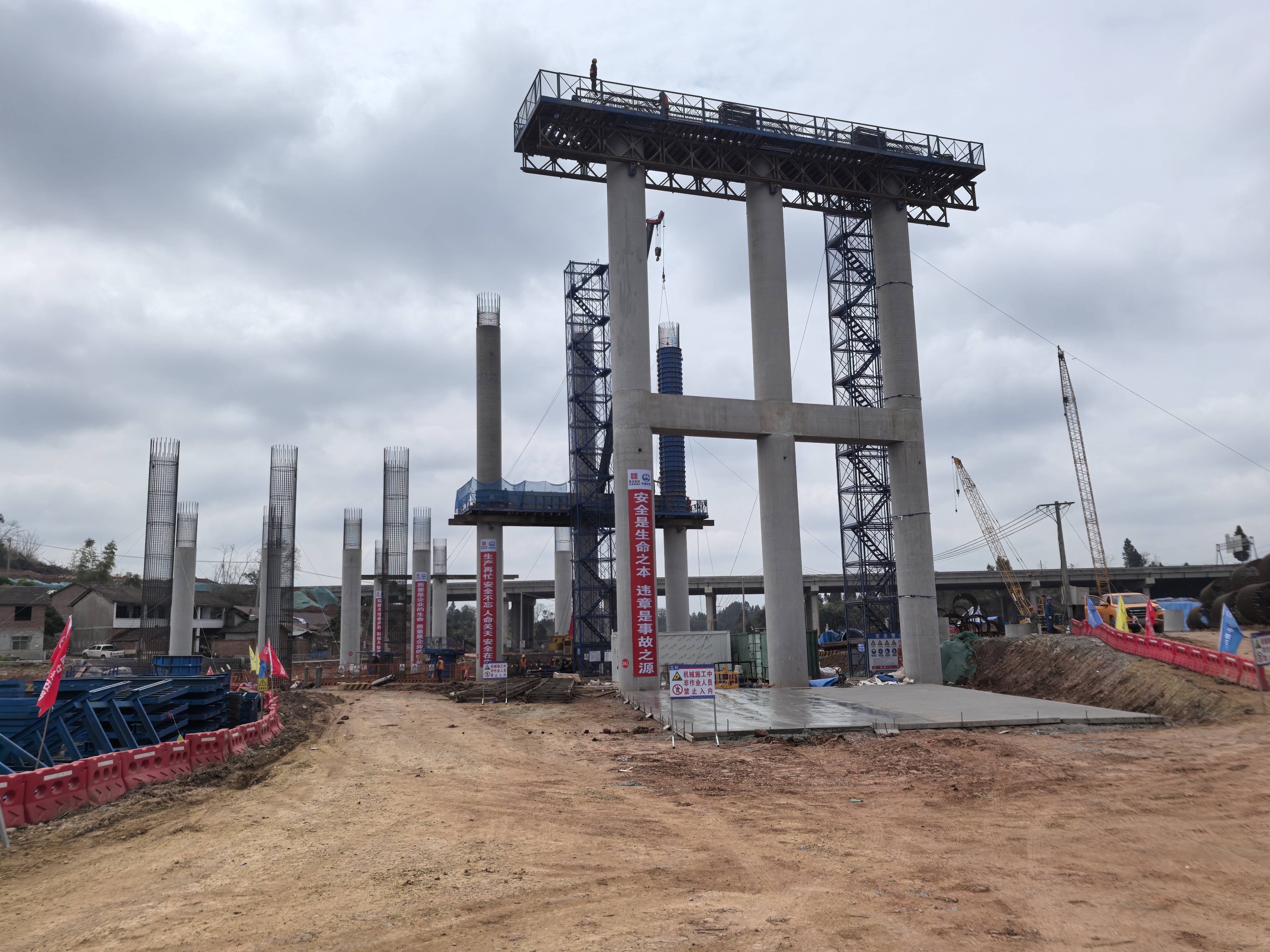 20余公里外的中和枢纽互通则是另一番“空中造城”景象。120名工人开足马力,240根桩基稳稳地扎入地下,上跨成资渝、遂资眉两条高速的“蜘蛛网”立交雏形初现。