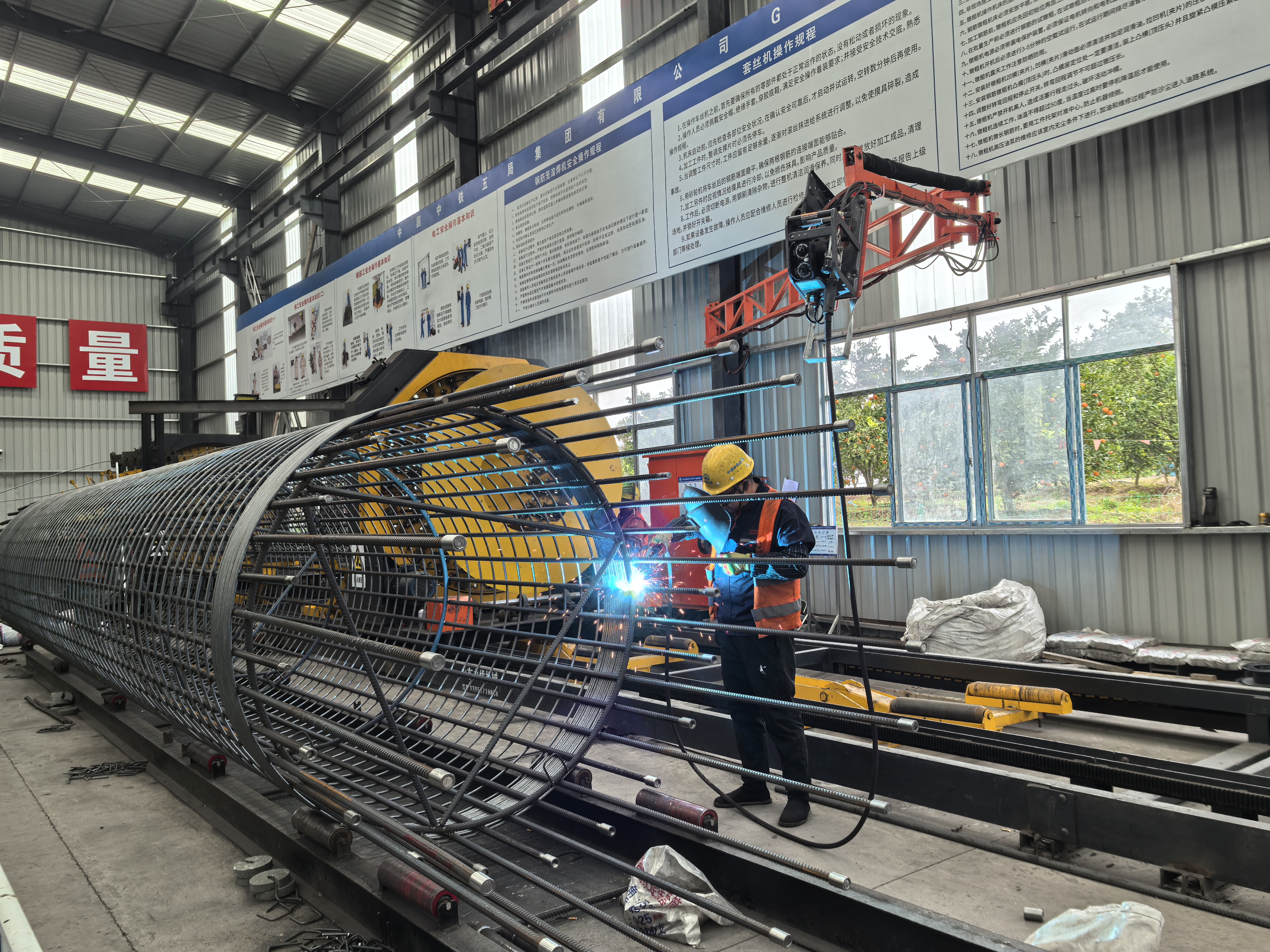 走进伍隍镇铺子坳村的钢筋加工厂,4台桁吊正轻松抓取成吨的钢筋,钢筋滚笼焊机高频、精准地焊接钢筋笼,数控平台将钢筋剪切、弯曲、套丝一气呵成。