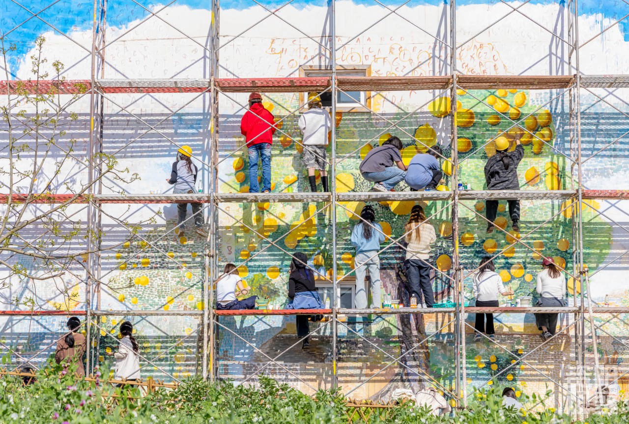 美院学生们正在红碑村创作《柠檬画语》壁画作品。