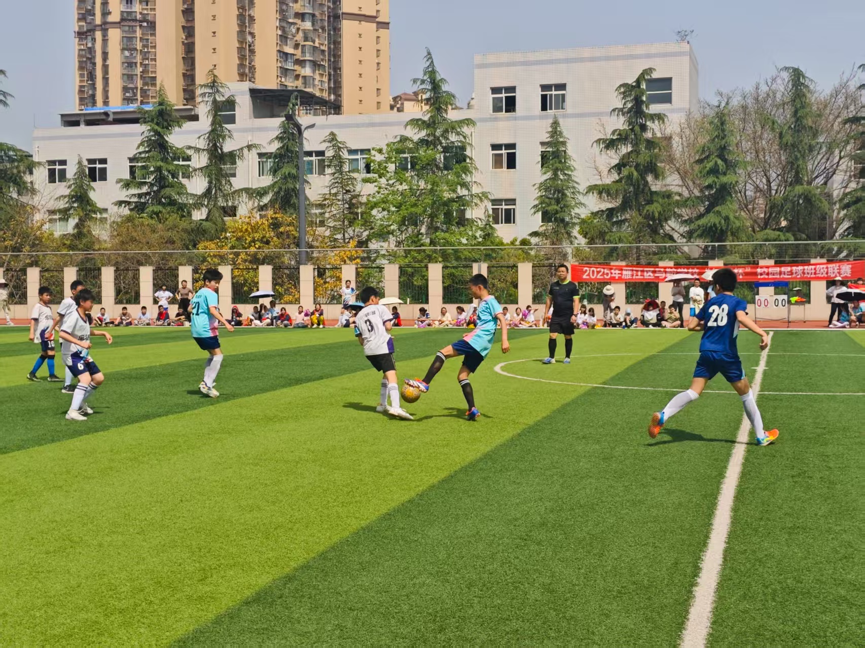 下午2点30分,阳光洒满马鞍学校的操场,一场激烈的足球争霸赛在9支队伍间火热开场。赛场上,小球员们精神饱满,目光坚定而炽热。进攻时,他们如敏捷的猎豹,配合默契,巧妙传球,一次次犀利突破、有力射门,尽显精湛球技,引得围观的师生们欢呼不断。尽管汗水打湿球服,但学生们的脸上始终洋溢着灿烂笑容。