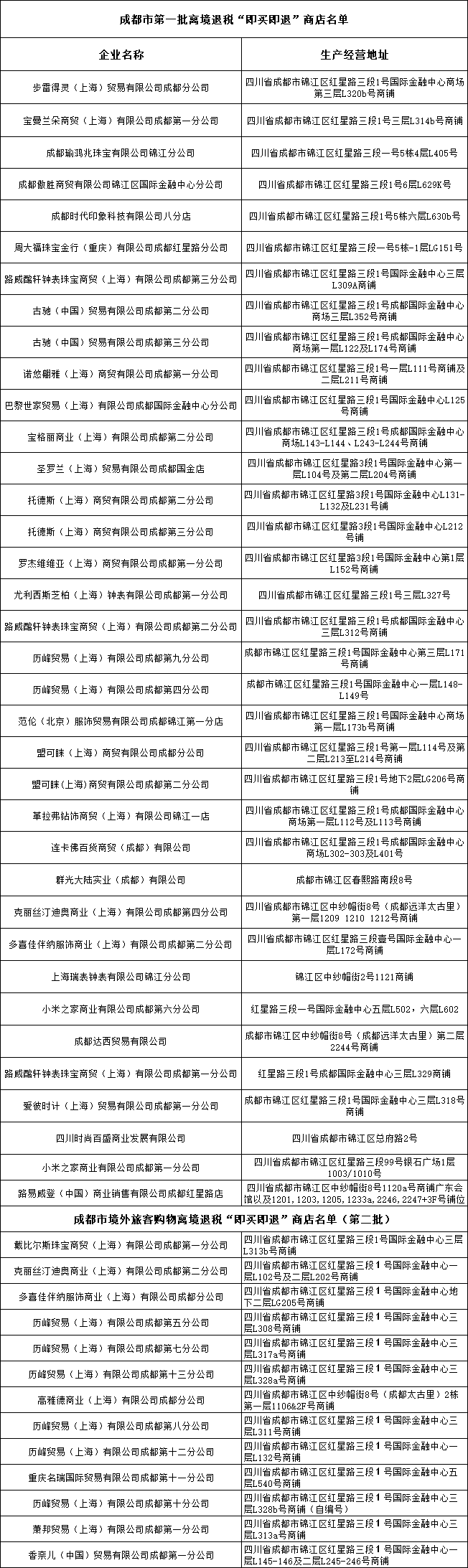 此前,《国家税务总局成都市税务局关于开展境外旅客购物离境退税“即买即退”便利化服务试点的通告》以及《国家税务总局成都市税务局关于公布第二批境外旅客购物离境退税“即买即退”商店的通知》发布。目前,成都共有49家“即买即退”试点商店。