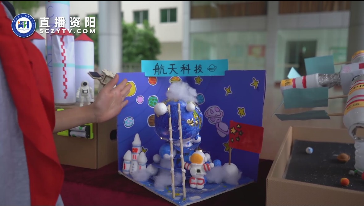 “这是用生活废弃材料制作的‘空间站’模型,它能通过两块电池板将光能转化为电能。”“这件手工作品名叫《航天科技》,是我根据想象自己制作的。”张开创意的翅膀,雁江区三贤九义校、安岳县工业大道小学的孩子们精心创作了一件件色彩斑斓、别具匠心的主题画作和手工作品,让航天梦想在指尖与画笔下绽放。