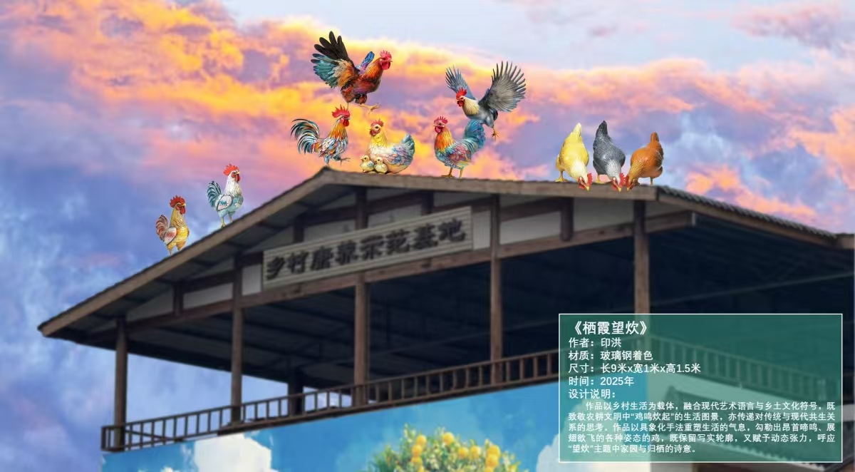 印洪告诉记者,他创作的作品《栖霞望炊》以乡村生活为载体,融合现代艺术语言与乡土文化符号,既致敬农耕文明中“鸡鸣炊起”的生活图景,也传递对传统与现代共生关系的思考。作品以具象化手法重塑生活的气息,勾勒出昂首啼鸣、展翅欲飞的各种姿态的鸡,既保留写实轮廓,又赋予动态张力,呼应“望炊”主题中家园与归栖的诗意。目前,包括3D大地彩绘、雕塑、装置艺术及墙体彩绘在内艺术作品创作正有序推进。
