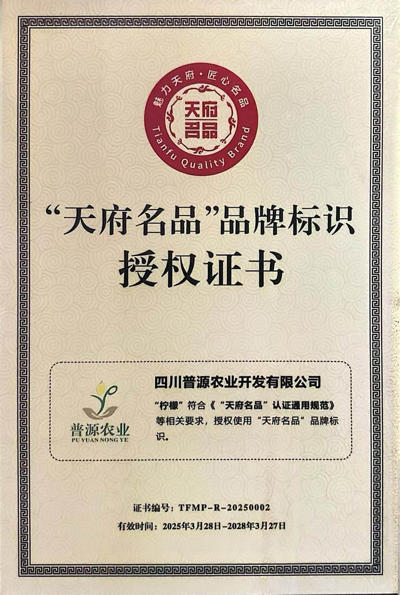 “天府名品”授权证书。